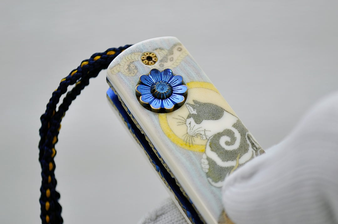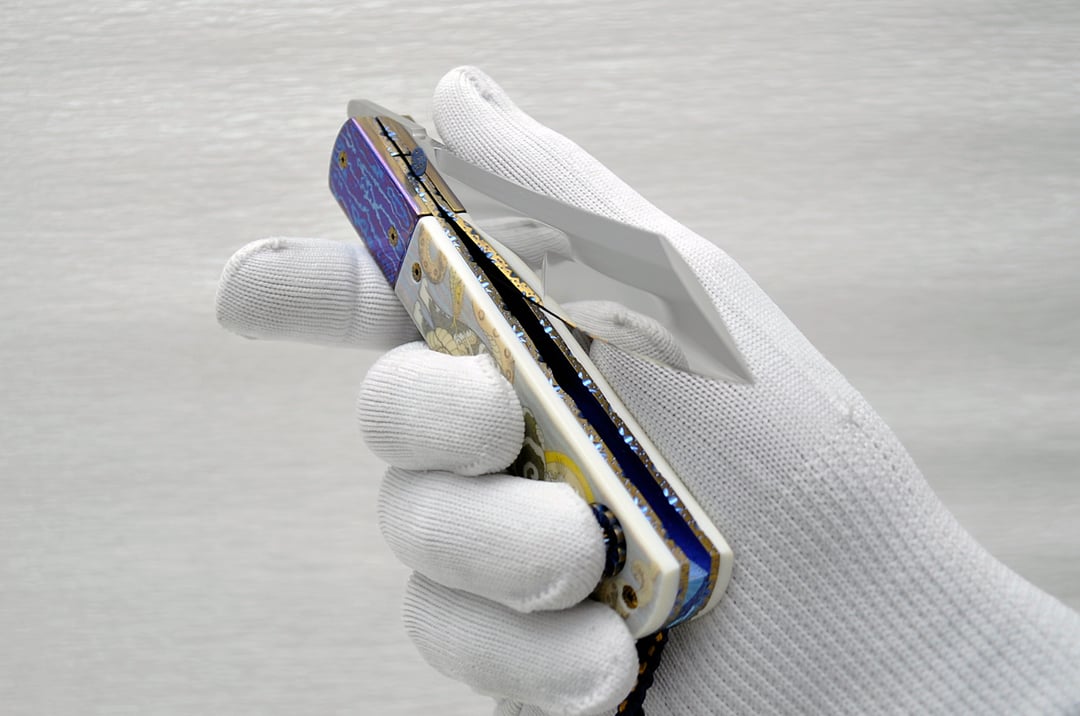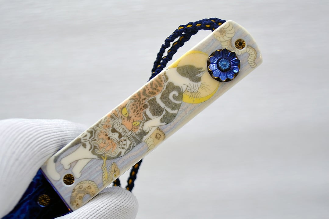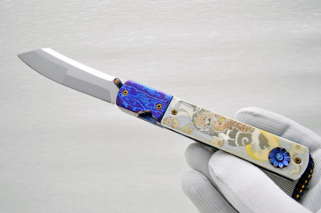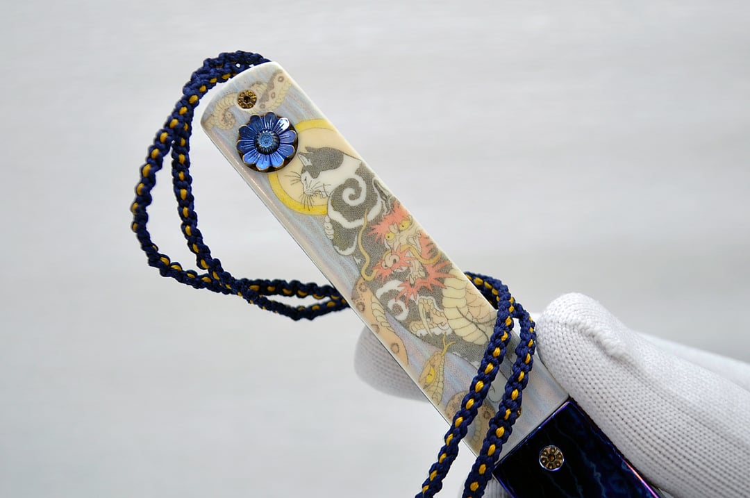 Titanium frame (engraved even under the scales 🤯), scrimshaw on walrus tusk, mirror polished blade with duplex grind, zircon, silk kumihimo.
