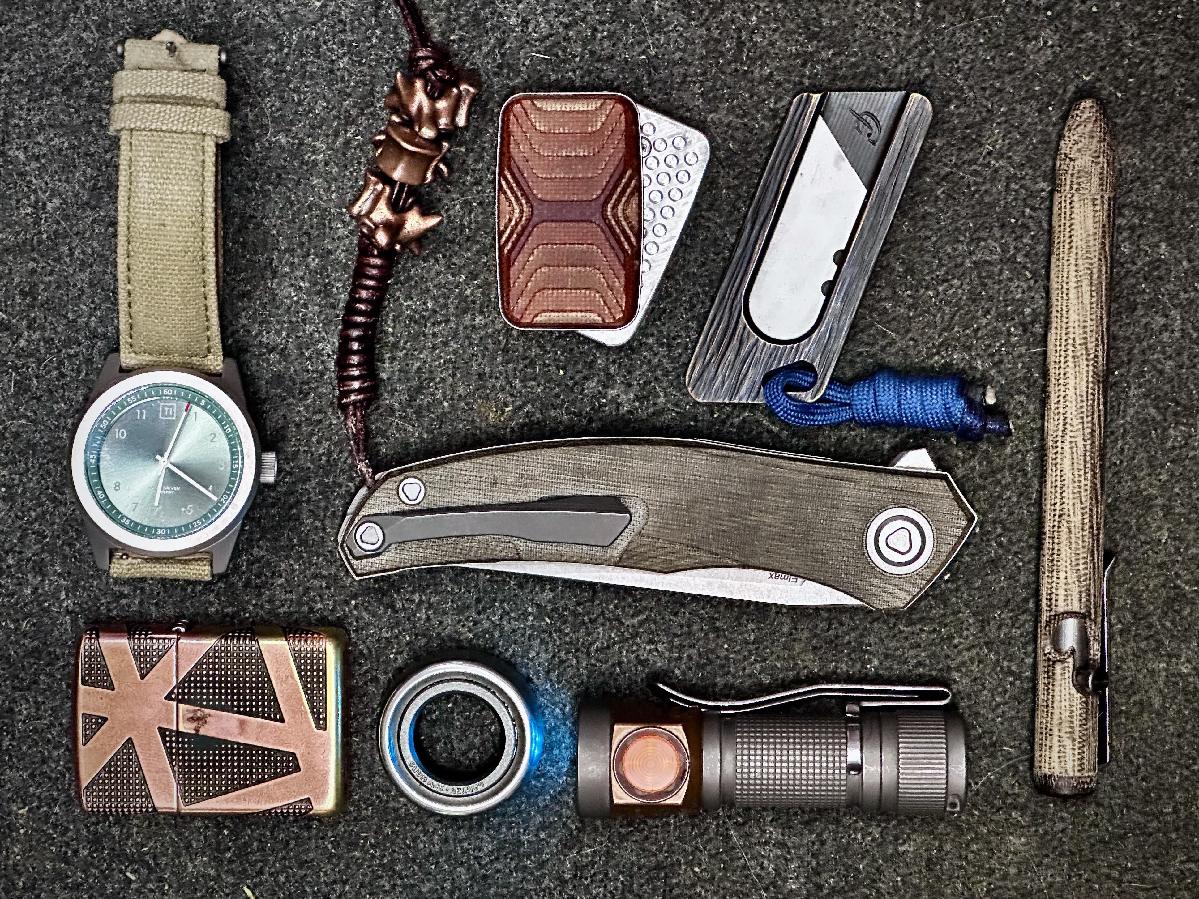 Clockwise from Top Left: BigIdeas Daily Solar Watch 2025, Magnus CyberGrub Vintage Micarta Fidget Slider, Compoform Shard utility knife in barked copper, Tactile Turn Bolt Micarta, Emisar D3AA Ti/Cu, Lautie Mechanic Ring, Zippo “Antiqued” Brass