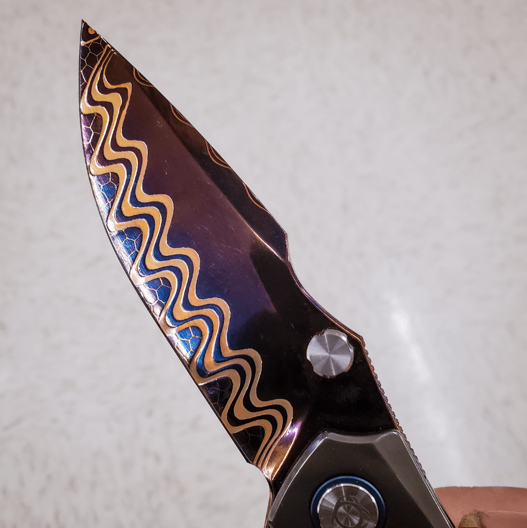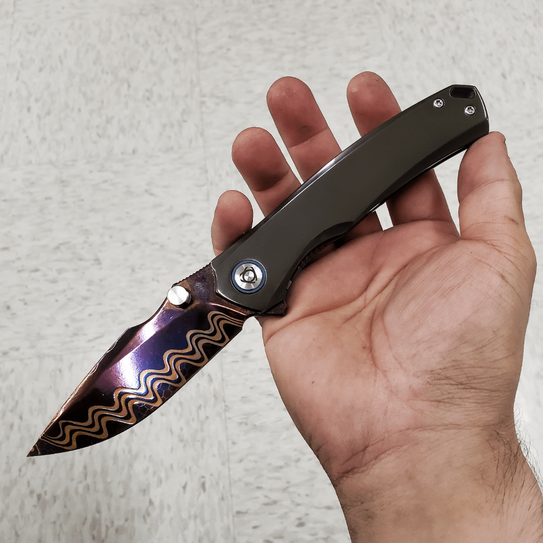 This thing is gorgeous and an absolute CHONKSTER. People weren't kidding when they said full solid Zirconium knives are heavy, the heaviest I had held before this was probably the copper North Mountain Blade chop that I got my brother for his birthday and I though that was pushing it for a pocket knife. This feels like carrying a small hand gun lol.