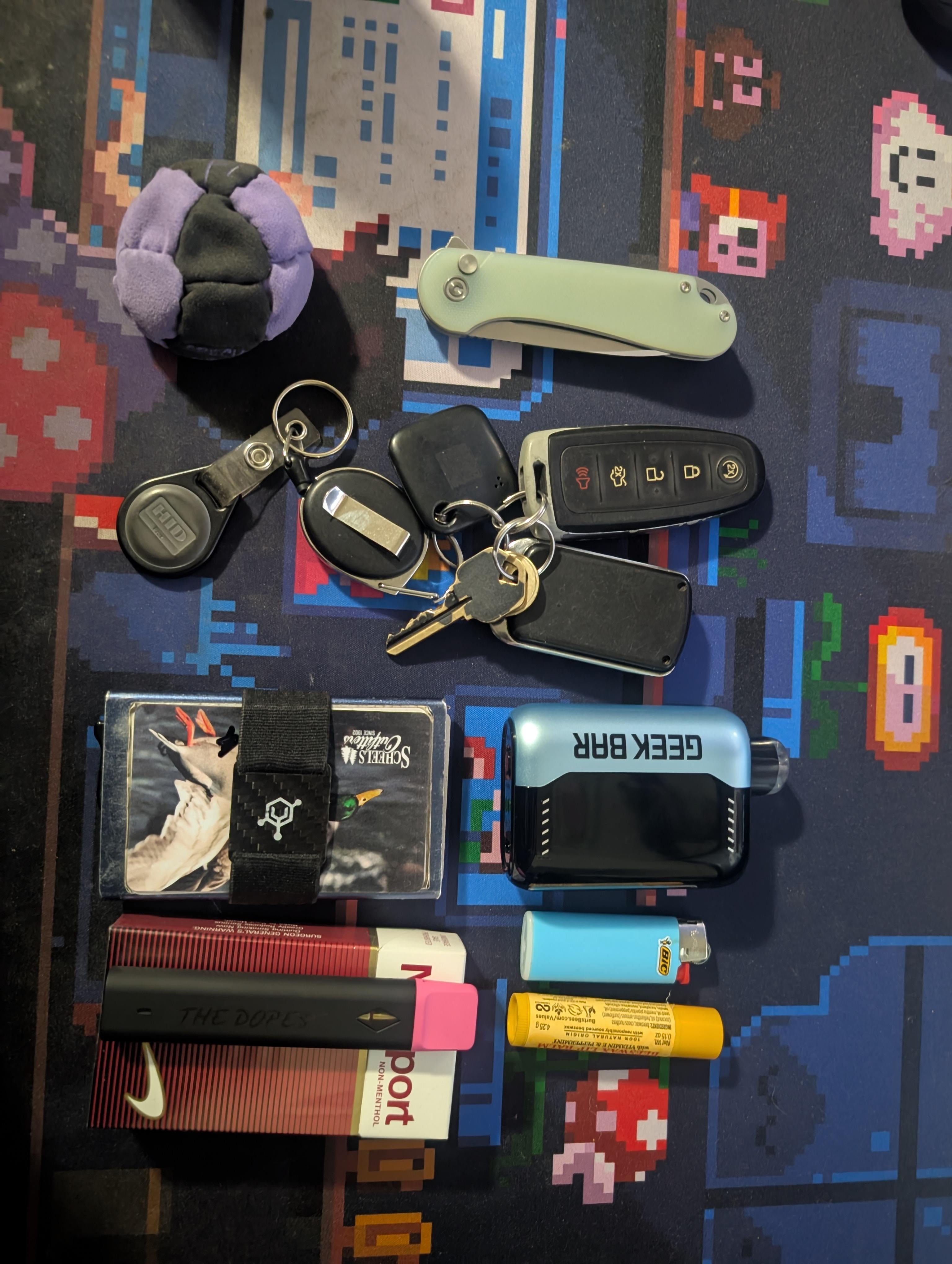 Top to bottom we have, 1 hacky sack, Civivi Elementum II, keys (must have, couldn't make it through my day without), code118 wallet, vape, smokes, weed pen, mini bic, Burt's beeswax