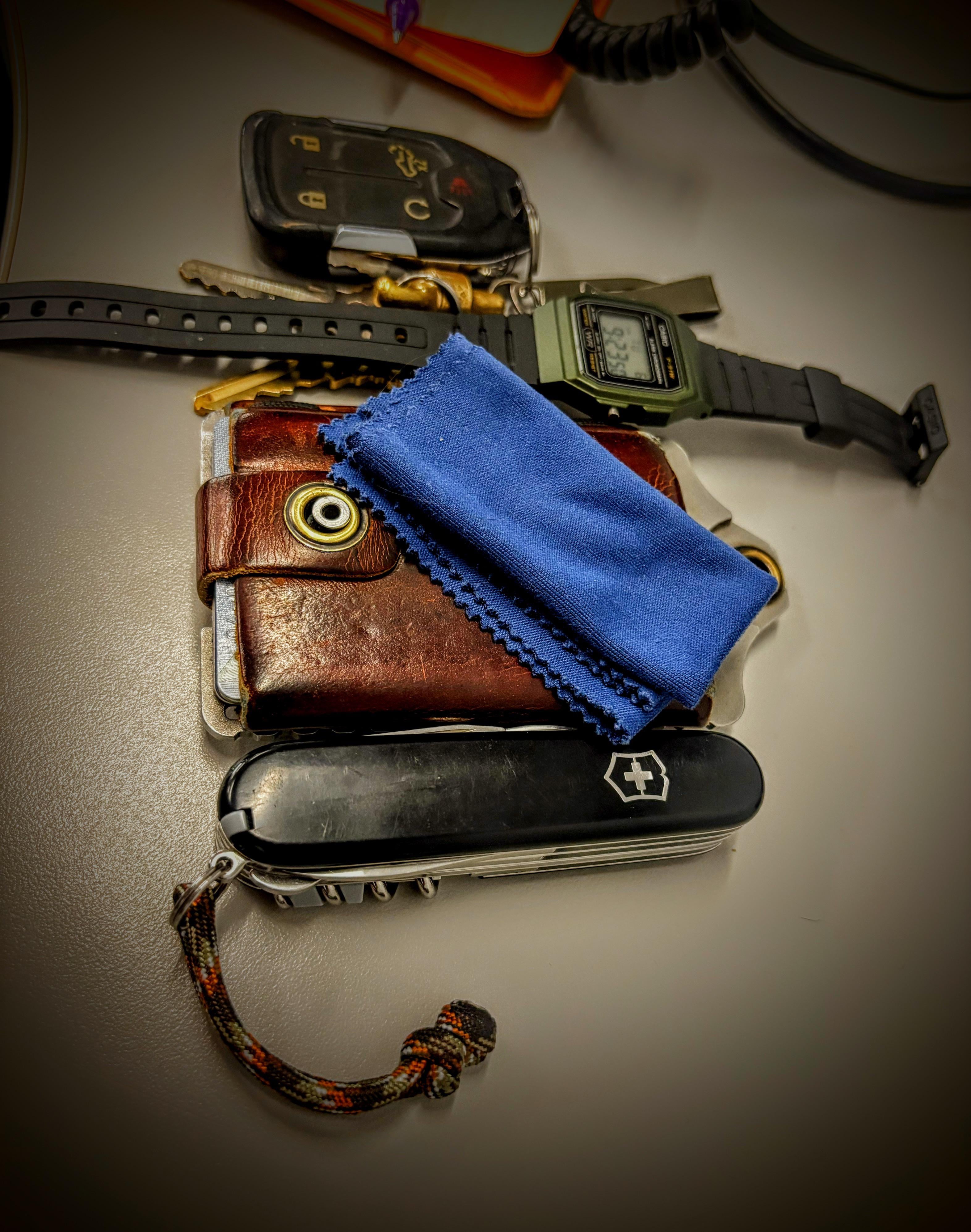SAK Huntsman Trayvax element wallet Casio f91w Keys with lynch NW pocket clip Microfiber cloth for my glasses. iPhone 15 plus taking the pic