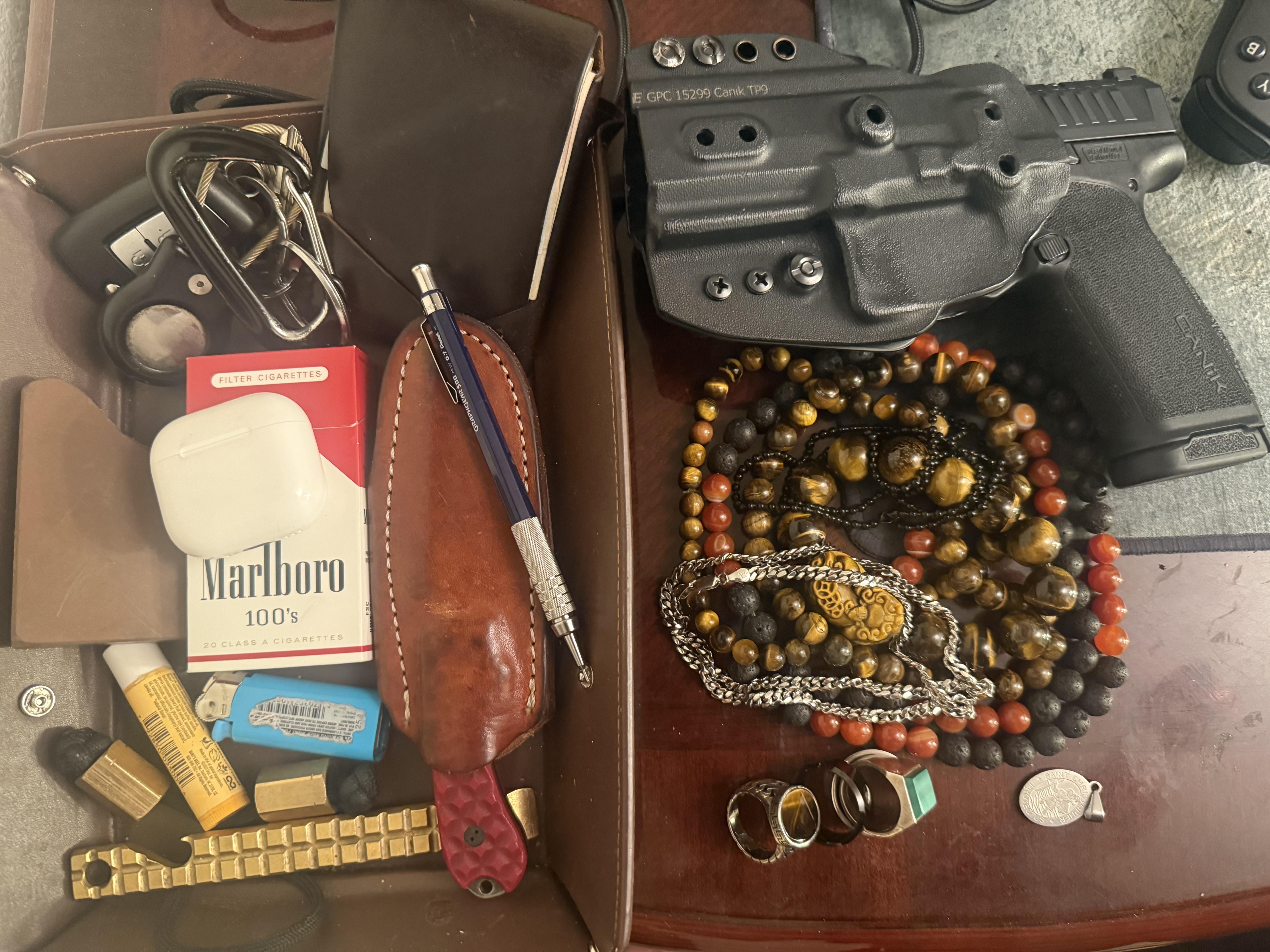 Drop pan: Bradford guardian 3 sheepsfoot, air pod 4, keys, wallet, lighter, stone, chapstick. Jewelery rotation and Canik mete mc9 prime