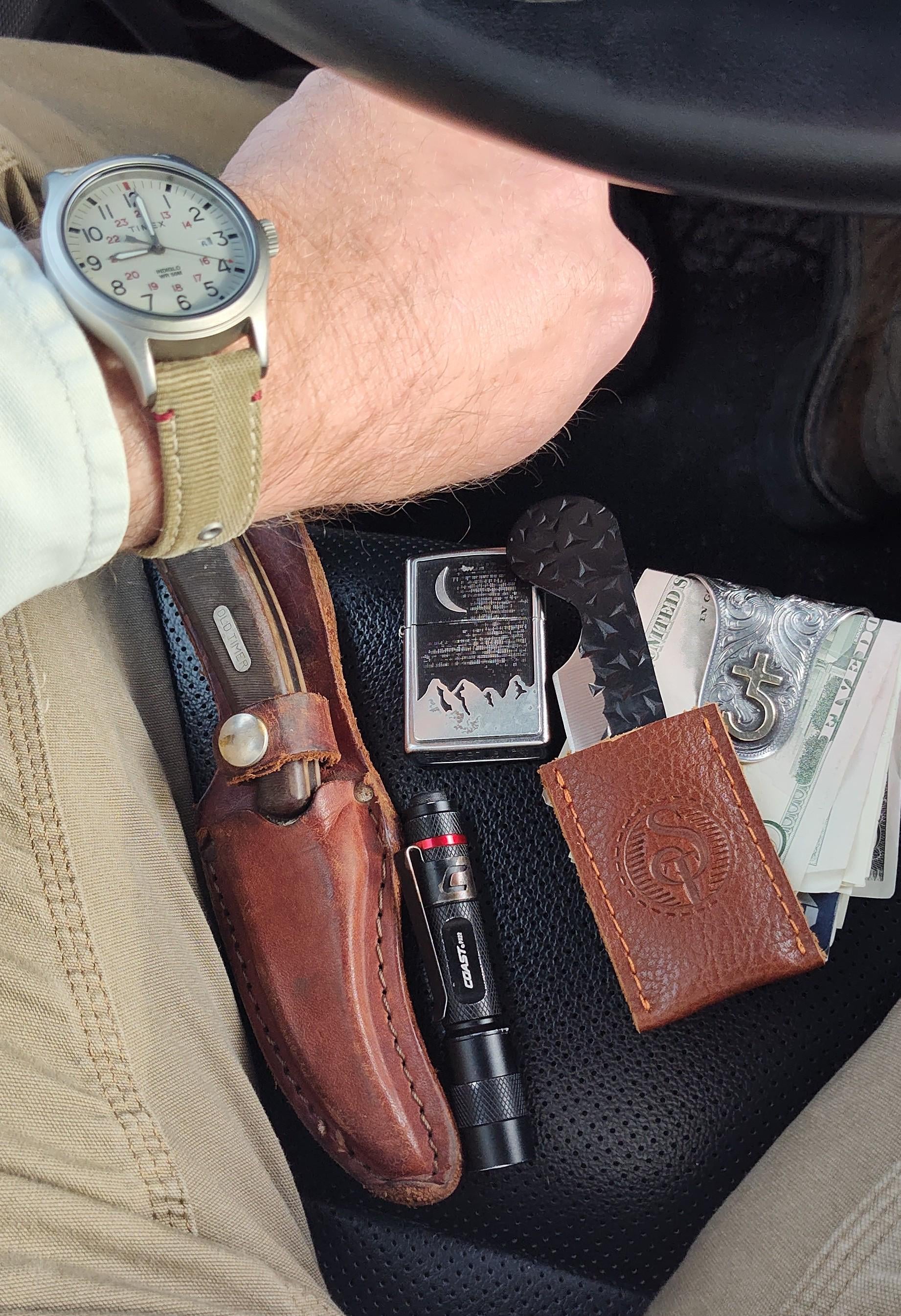 Just a casual Sketchy Tuesday! Timex MK1 with Tan Buckle Band, Walmart pen light, Zippo, Southern Trapper watch pocket knife, Old Timer 4 inch for the belt and money clip from Clint Orms.