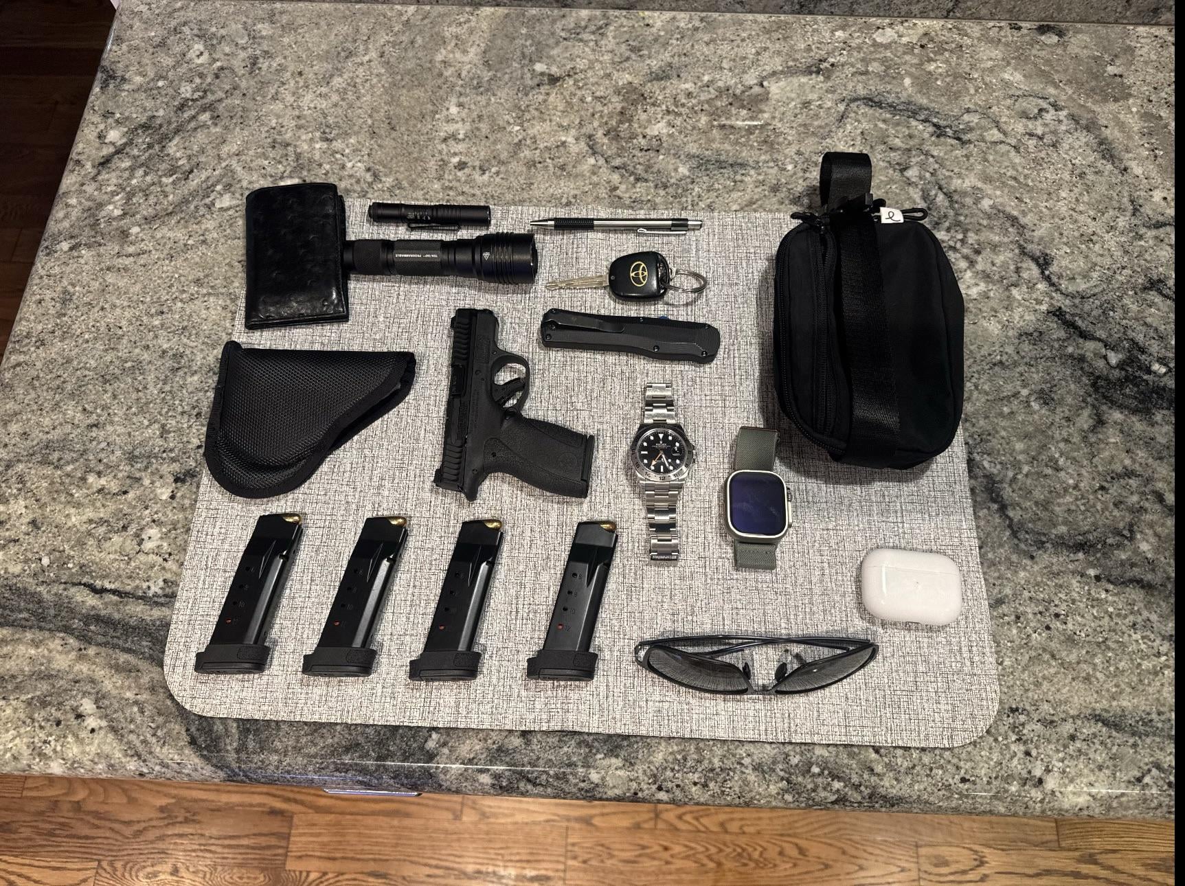 Wallet – Luchesse Ostrich Flashlights – Streamlight HL-X and Protac Pen – Zebra Knife – Benchmade Autocrat Watches – Explorer ii and Apple Watch Keys Handgun – S&W Bodyguard 2.0 with 4 extra 12 round magazines (which are impossible to top off bc I have sissy thumbs) Holster – Cabelas Pocket Holster Glasses – Maui Jim AirPods Fanny pack – unknown