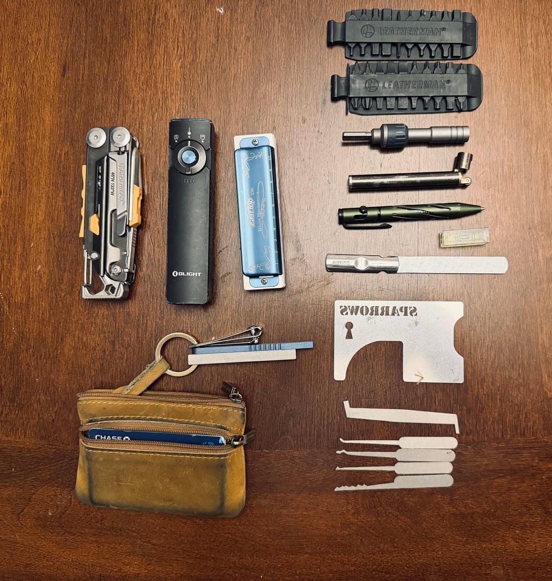 Leatherman Signal, Olight, Harmonica, Leather Coin Purse, Cards, Nail Clippers, Tweezers, Mighty Pry Bar, iPhone 17 Pro Max, Leatherman 42 Bit Set, Leatherman, Ratchet, Lighter, Olight Pen, Level, Metal File, Sparrow, Hall Pass door opener, Lock Pick Set