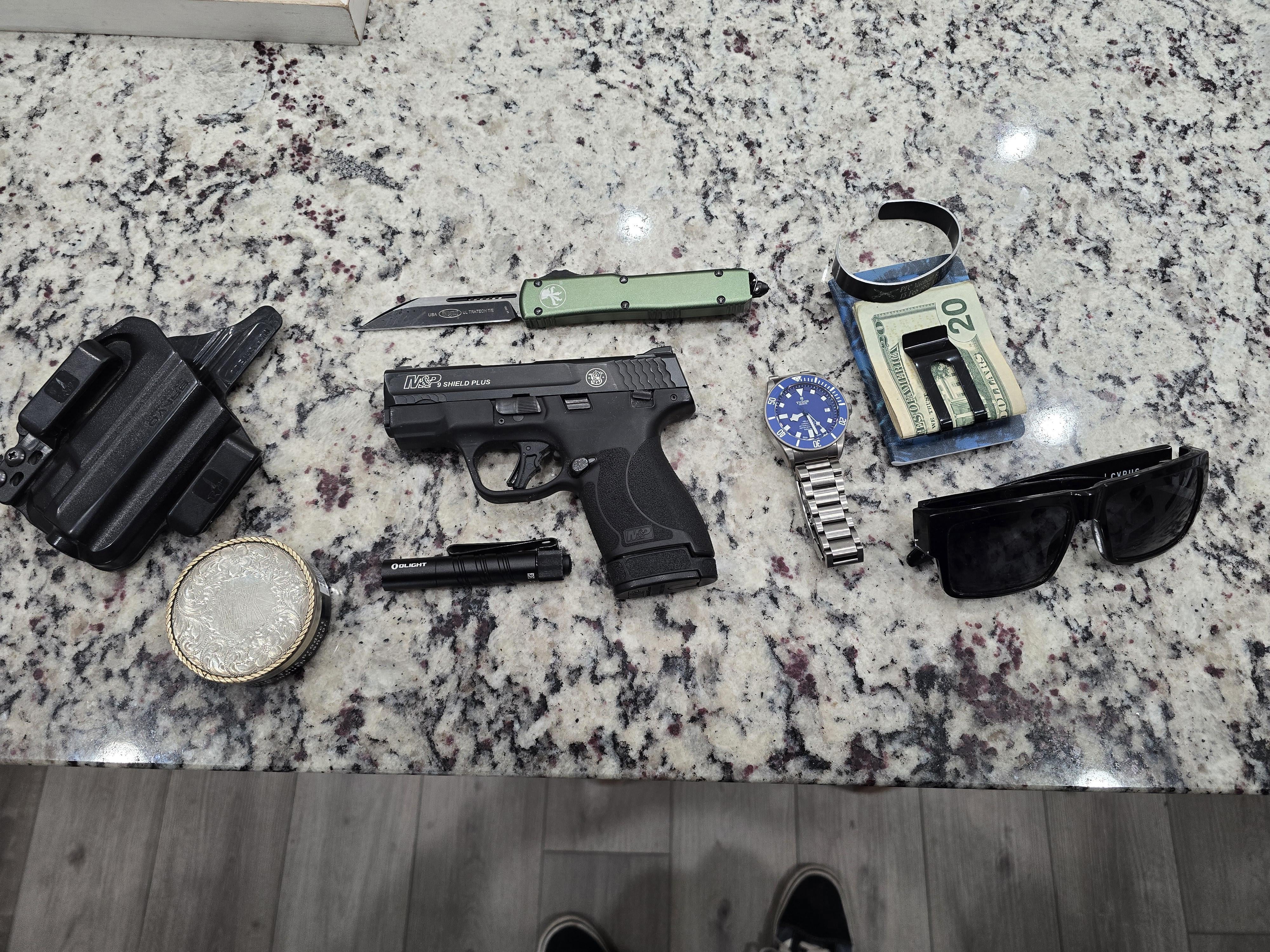 Bravo concealment holster, Custom dip can lid hand engraved, olight mini flashlight(300lumen) M&P shield plus, microtech otf, tudor pelagos, eclipse holster kydex wallet, KIA band for my G.W.O.T. boys, and spy Cyrus sunglasses. On my way to the VA today wish me luck