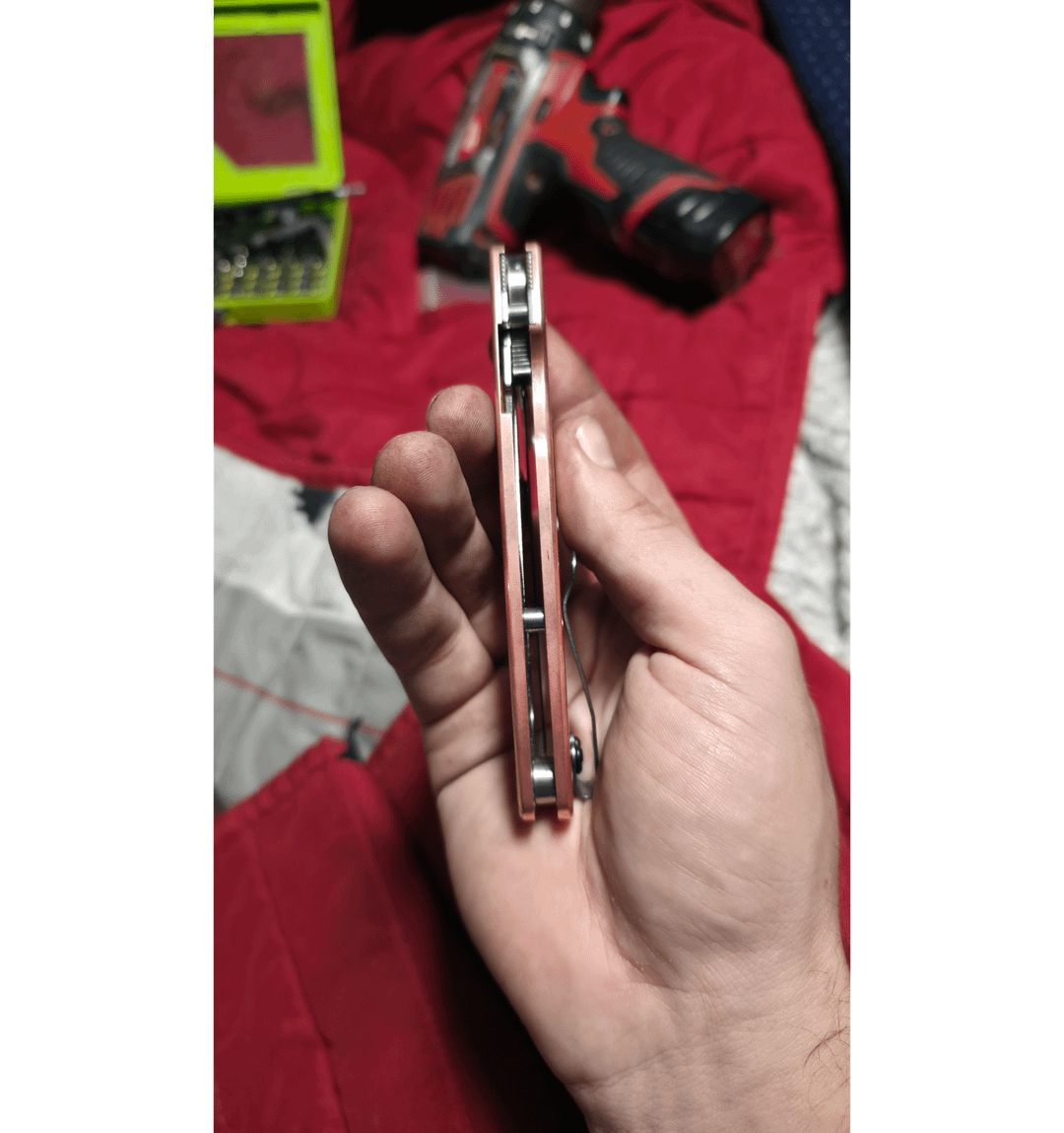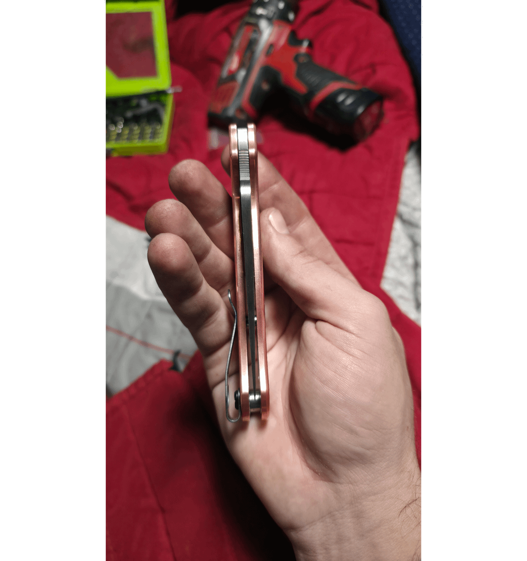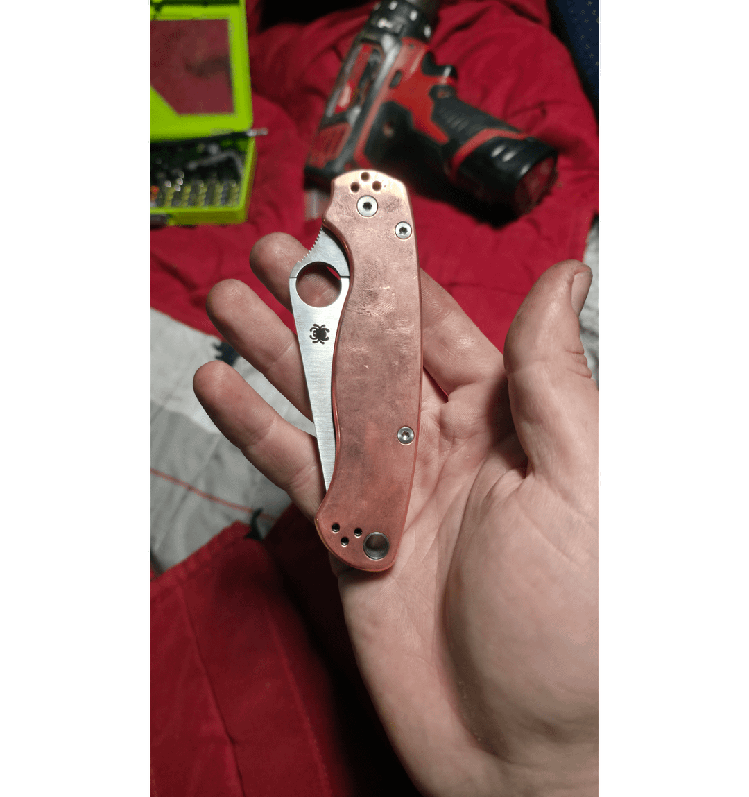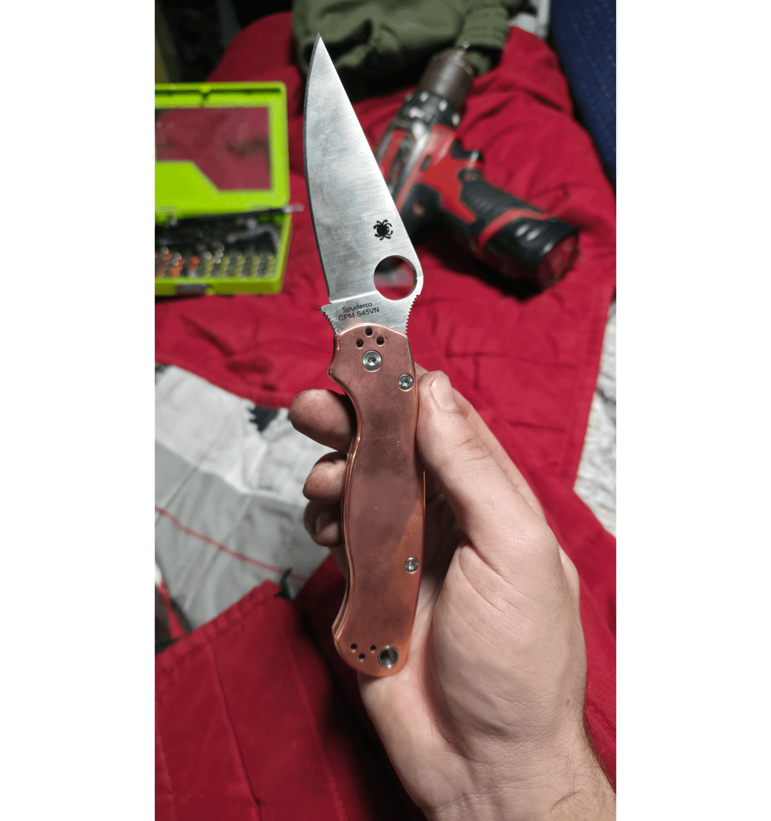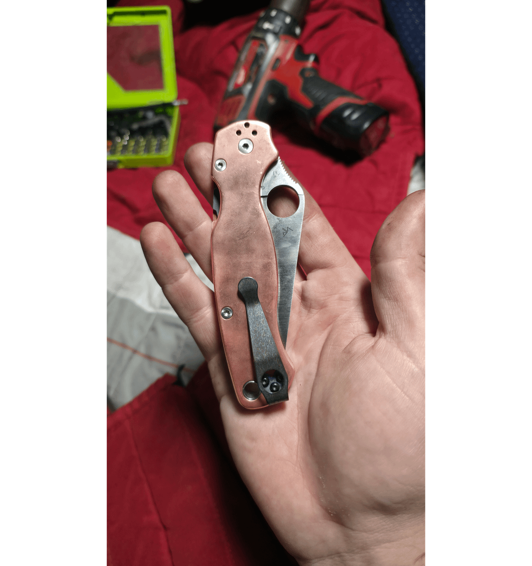 Got my first Spyderco knife today, along with a set of copper scales and a titanium deep carry clip. I plan on shipwrecking the copper which is the reason for the color of the clip. I also ordered a matching titanium backspacer. I chose the Paramilitary 2 for a few reasons, the size is pretty ideal for me as im used to carrying an old buck 110 I bought when I first enlisted in the military, but the weight was a little light for me so I got the copper. I really like the blade shape and steel and the reviews for the PM2 are overwhelmingly positive, and the customization options were very attractive to me because I love to make things my own