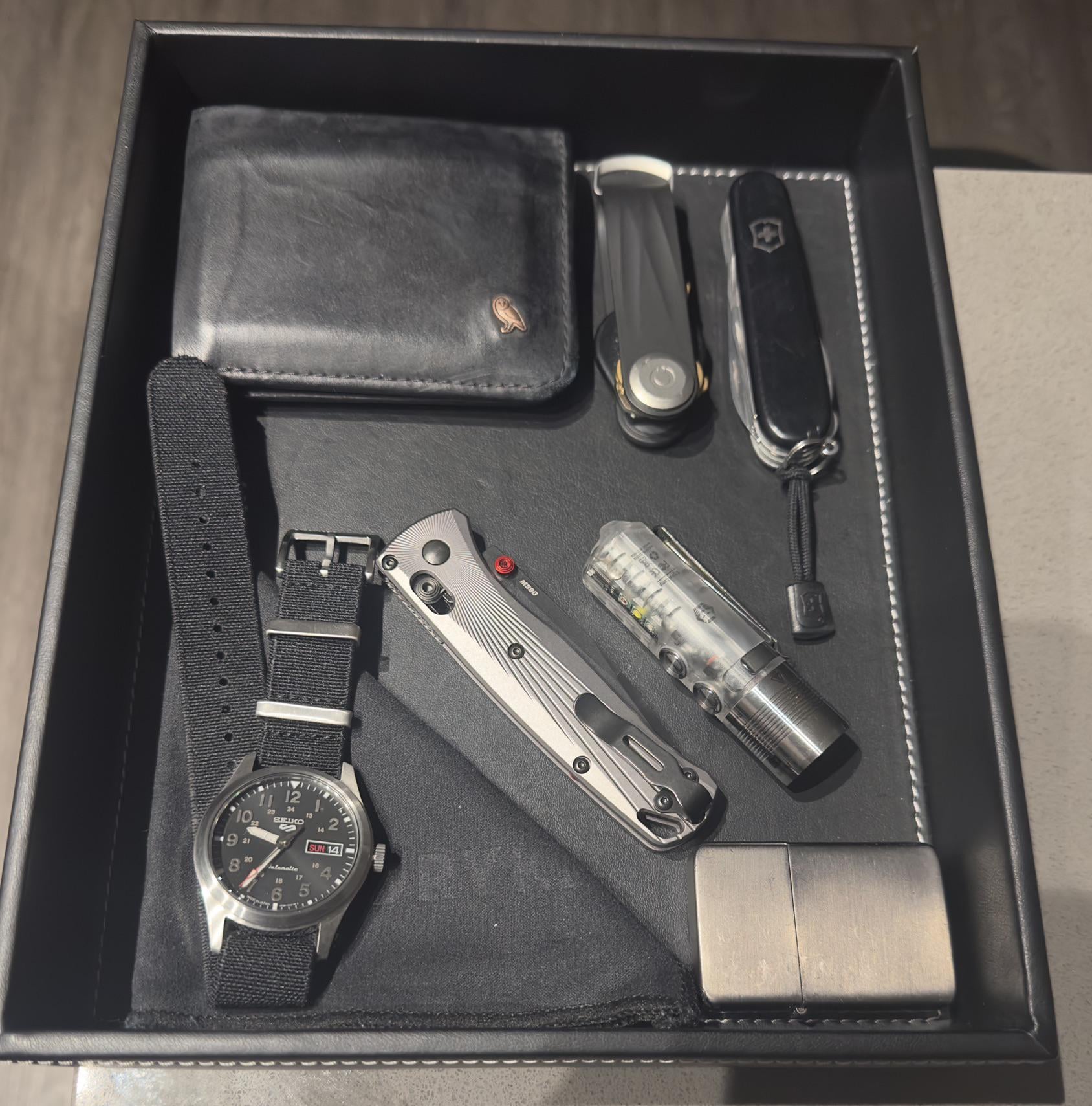 In EDC Happy Thursday January 8, 2026 Top left to bottom right: – Bellroy Hide & Seek – Orbit Key Solution – SAK Climber – Seiko SRPG27 on a StrapHabit NATO – Dryki Hank – Benchmade Bugout – RovyVon A28 Gen 2 – Thunderbird Butane Zippo insert by Due-Delivery-3434 EDC Prev Post Some finds from yesterday, oldies January 8, 2026 Next Post Opinions on a $115 premium for a Ti version? Way overpriced? January 8, 2026 Related Posts Wednesday Carry January 14, 2026 EDC Tuesday Pocket Dump January 14, 2026 My today EDC January 14, 2026 1 Comment AutoModerator 6 days ago Thank you for posting to r/EDC! Include a detailed item list (make/model) within **1 hour** of submission. Lists can go in the title, a comment, or the image. Posts without lists will be removed. If you have already provided a list, not further action is needed, thanks | [FAQ](https://www.reddit.com/r/EDC/wiki/faq)*I am a bot, and this action was performed automatically. Please [contact the moderators of this subreddit](/message/compose/?to=/r/EDC) if you have any questions or concerns.*Write A CommentYou must be logged in to post a comment.