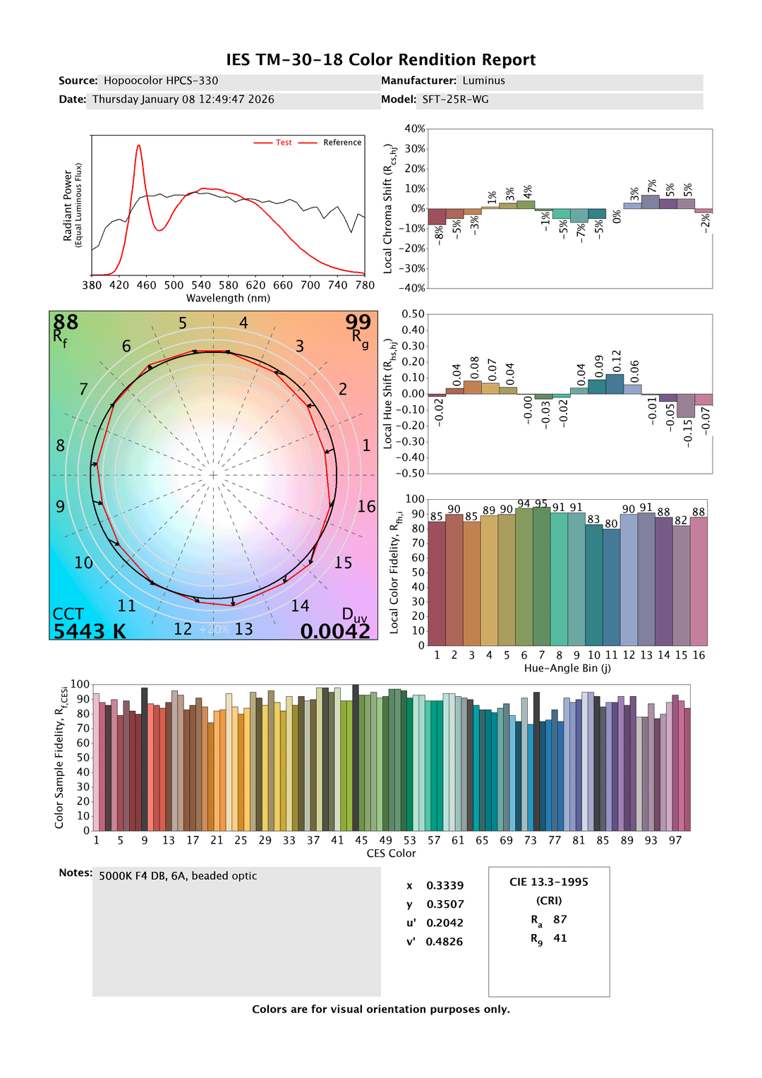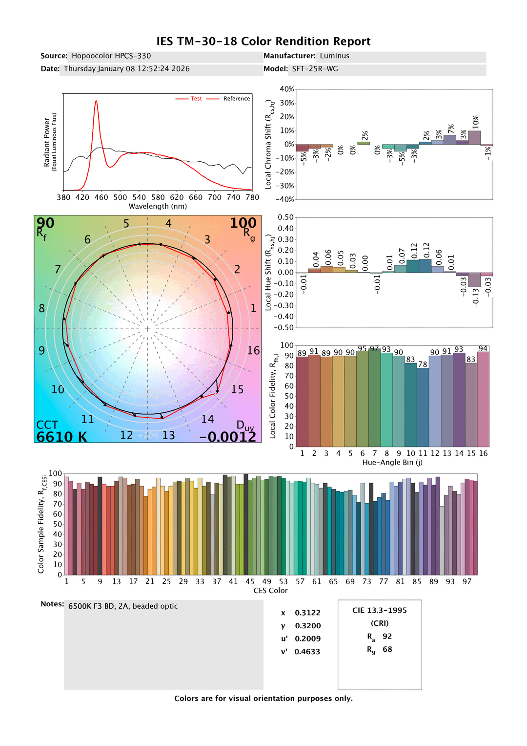 I took some informal measurements of the new CRI 90 SFT-25R-WG that Kaidomain recently listed for sale. The LEDs are reflowed to an MCPCB, and mounted on a heatsink with a generic beaded optic. The CA 5700K and BD 6500K look superb, with nice neutral tint. The 5000K is a higher DB bin, so the tint is disappointing as expected. I also took a measurement at a higher current, and unfortunately the colour rendering gets worse without any tint improvement.