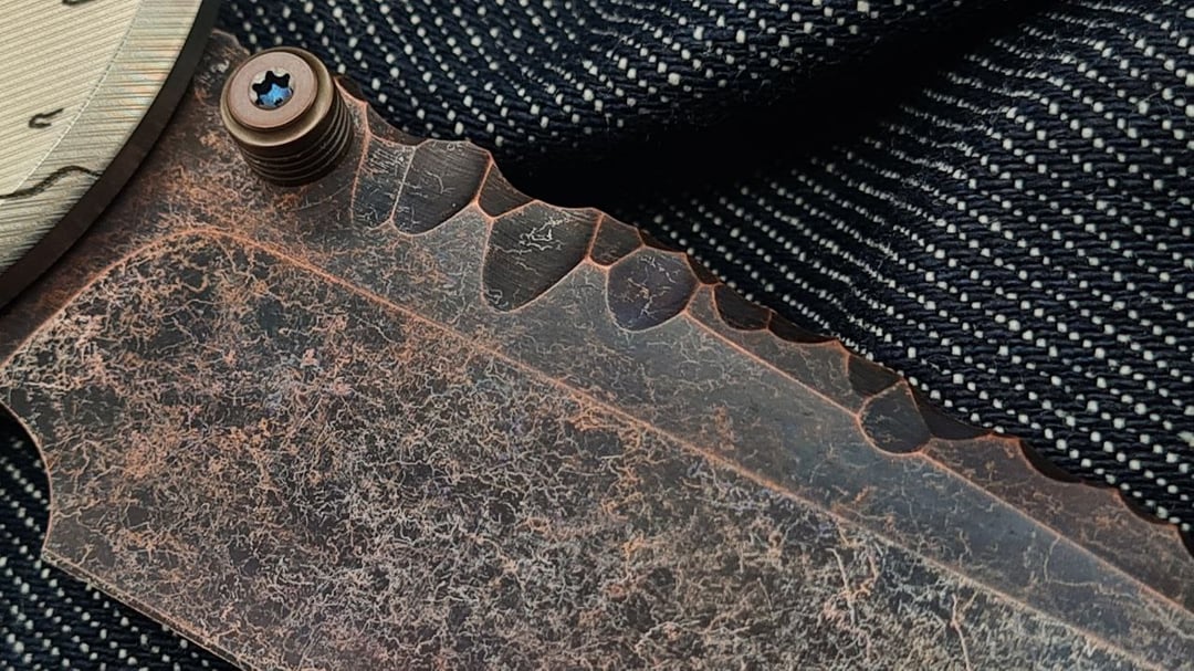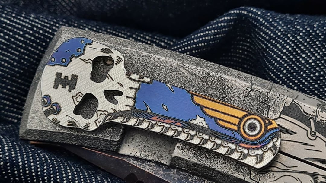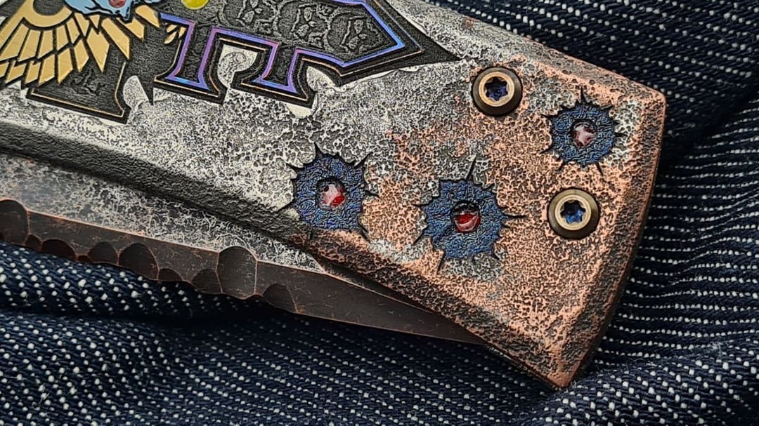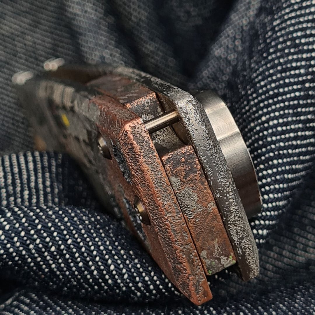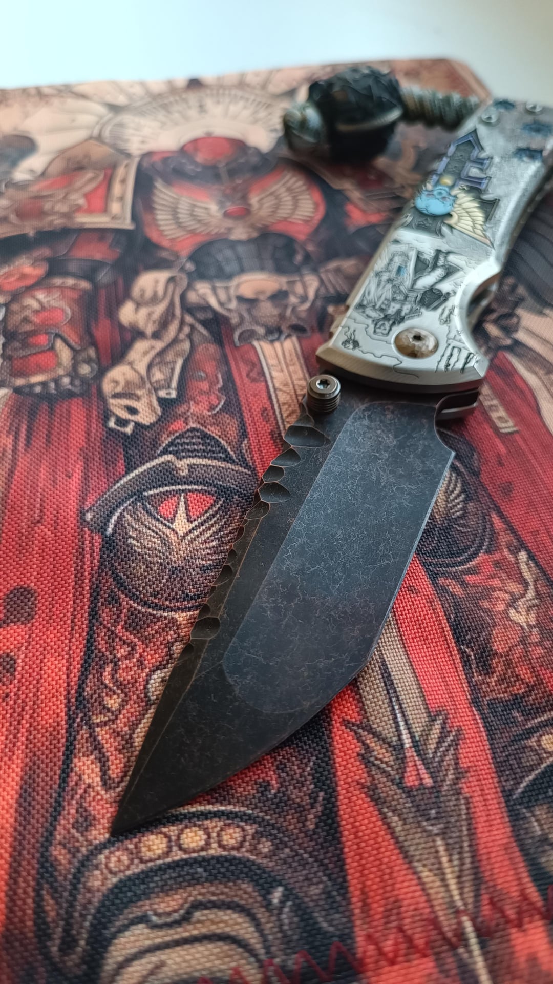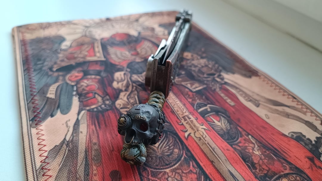 Sometimes one hobby mixes with another, and I hope that Gothic vibes of grimdark W40k future blended well on this Chaves ultramar Redencion. Weathered and painted by talented master S.Bondarenko into an inquisitorial theme. Quite complex and deep laser engraving, enamel, blade tang carving, even the internals are painted with aquilas. As a knife lanyard admirer, the absence of such option always bothered me on Chaves knives, so this one has a cutout in the backspacer with a pin installed. The bead is 3d printed titanium servoscull. Now the knife is on Skiff bronze washers. If you ever doubt if they are good – be assured, the mechanics is great and the knife is still rock solid.