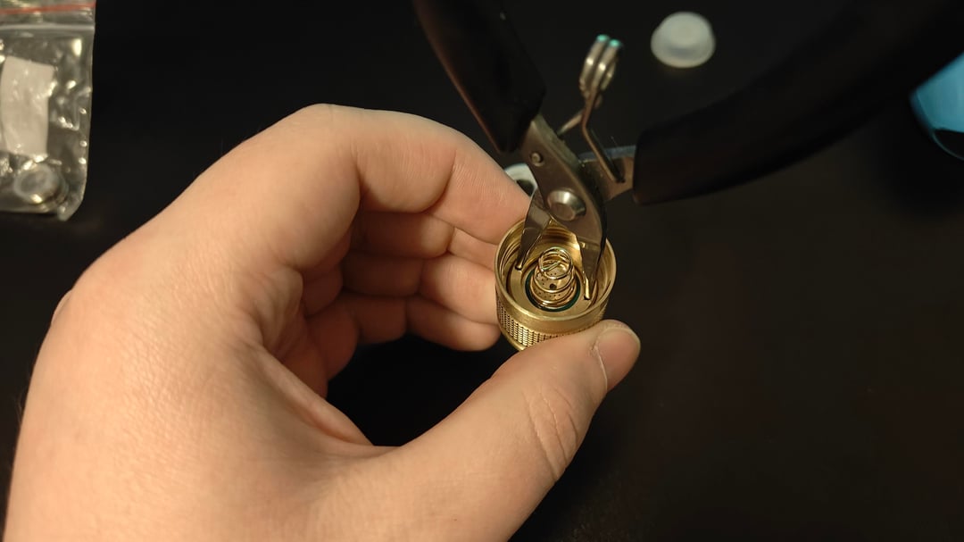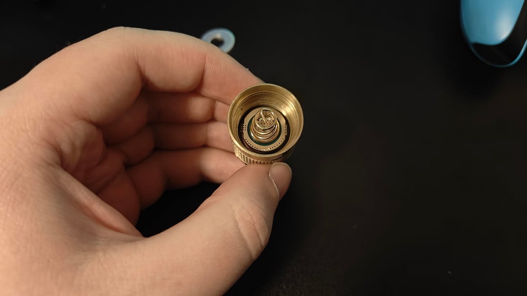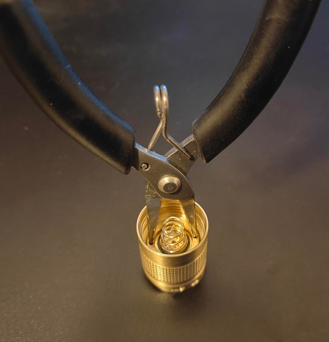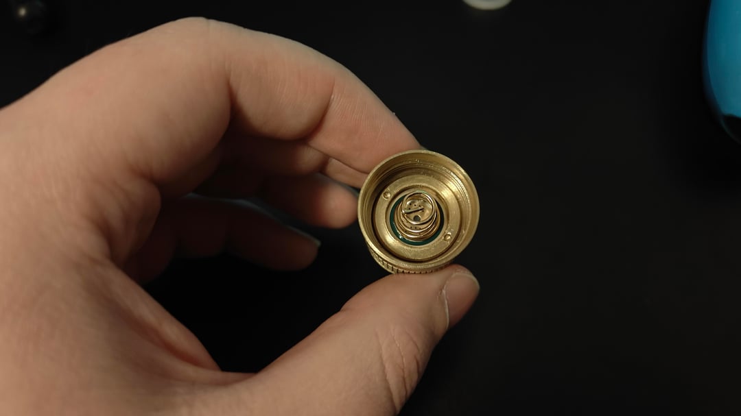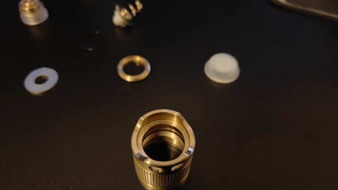 5. Place the o-ring on the button like shown and screw the metal button in the plastic adapter