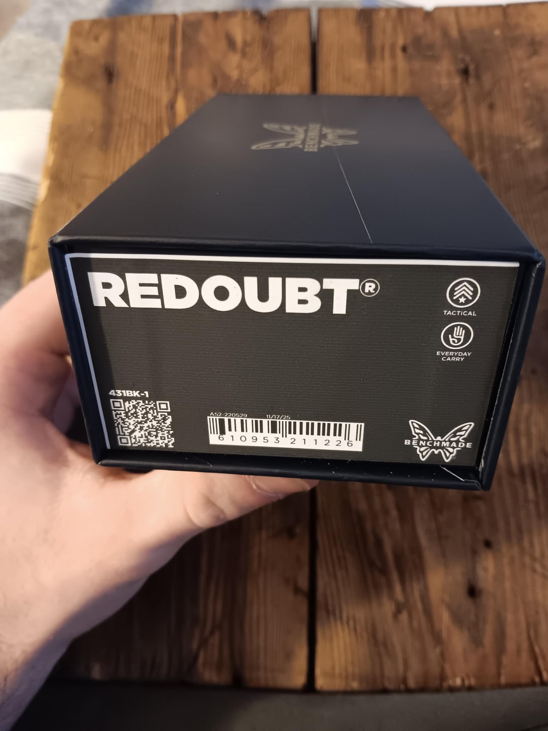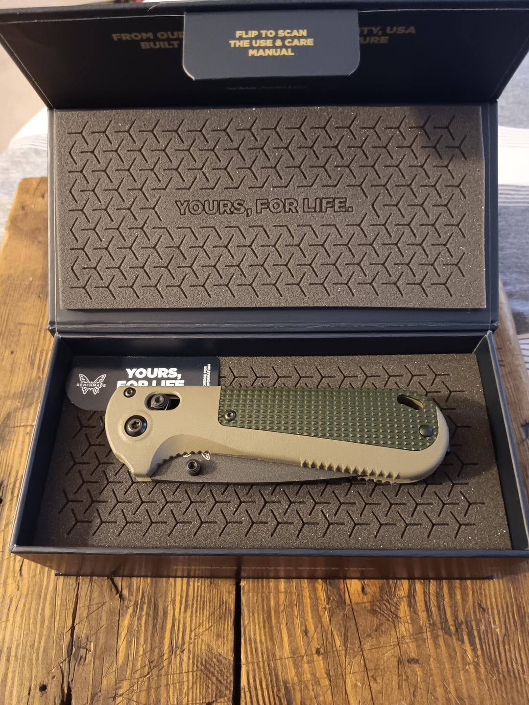 First benchmade I have ever bought brand new. The new box is cool, the knife is bigger than I thought but not by much and I'm ok with that. I hate the pocket clip on it and the scales are alittle on the aggressive side. So I ordered awt scales. I'm excited to put them on when they get here
