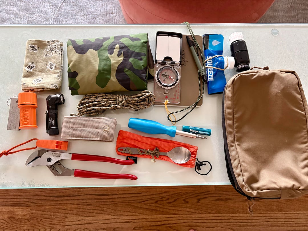 USGI USMC Assault Pouch: 100% Cotton Bandana, Bushcraft Outfitters Military Poncho, Suunto MC-2 Compass with a Brunton Lanyard, Rite in the Rain notebook and ballpoint pen, Sawyer 2 Liter water bag and micro filter, Doan Mag Bar, UCO Matches, Streamlight 90 Degree Flashlight, 750# Paracord with Boline Knot, Leatherman Wave+, Channellock 6-1 Screwdriver, Blistex Lip balm, Emergency whistle, Toaks Ti spoon with cord keeper, Wilde Tool 10" Tongue and Groove pliers.