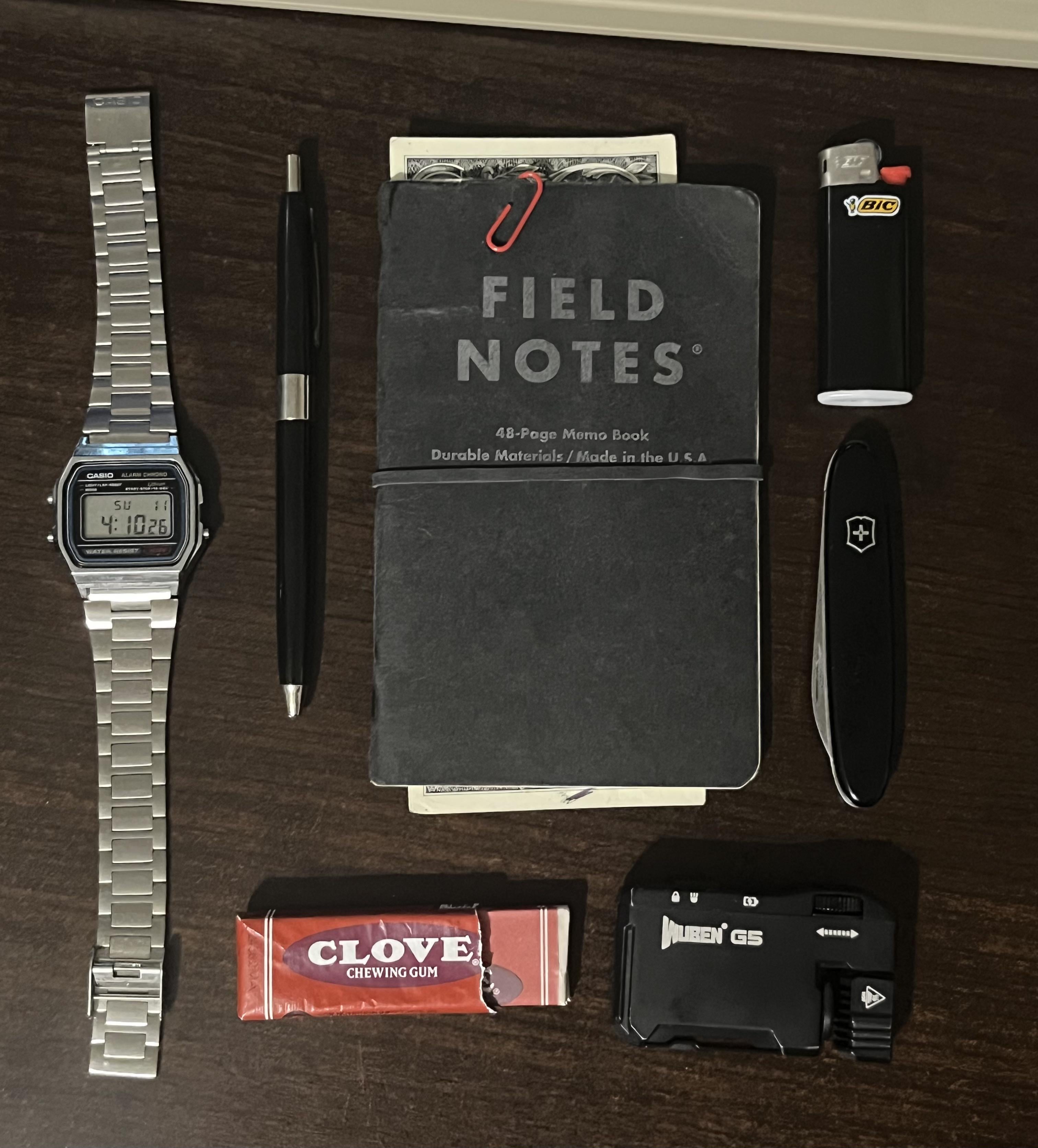 In EDC Walk in the park January 12, 2026 Nothing fancy for my Sunday, but felt like sharing anyway.Casio A158WSkillcraft U.S. Govt PenField Notes w a few bucks in it.Mini Bic lighterVictorinox pen knifeClove gumWuben G5 pocket flashlightby Ordo_Nekro EDC Prev Post Snow Tiger spotted January 11, 2026 Next Post Hinderer XM-24 January 12, 2026 Related Posts Hump Day Carry January 14, 2026 My EDC – But i like to call it AA – Annoyance Avoider January 14, 2026 Wednesday Carry January 14, 2026 1 Comment AutoModerator 2 days ago Thank you for posting to r/EDC! Include a detailed item list (make/model) within **1 hour** of submission. Lists can go in the title, a comment, or the image. Posts without lists will be removed. If you have already provided a list, not further action is needed, thanks | [FAQ](https://www.reddit.com/r/EDC/wiki/faq)*I am a bot, and this action was performed automatically. Please [contact the moderators of this subreddit](/message/compose/?to=/r/EDC) if you have any questions or concerns.*Write A CommentYou must be logged in to post a comment.