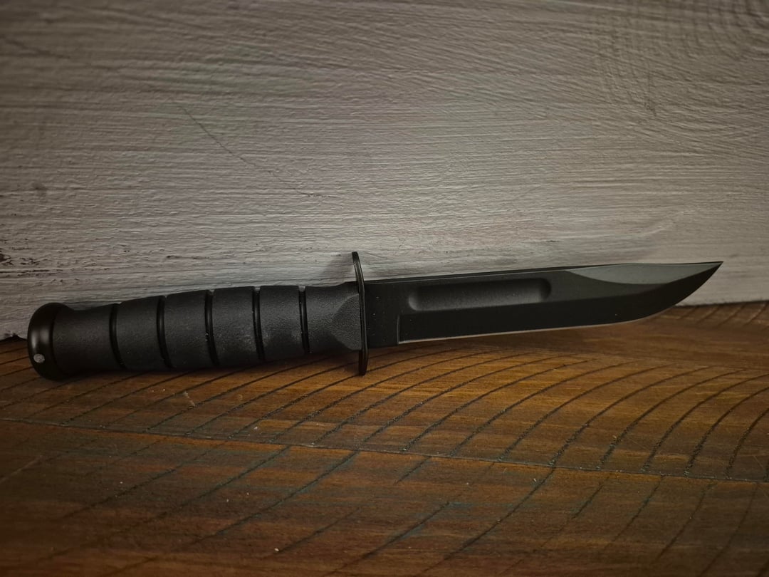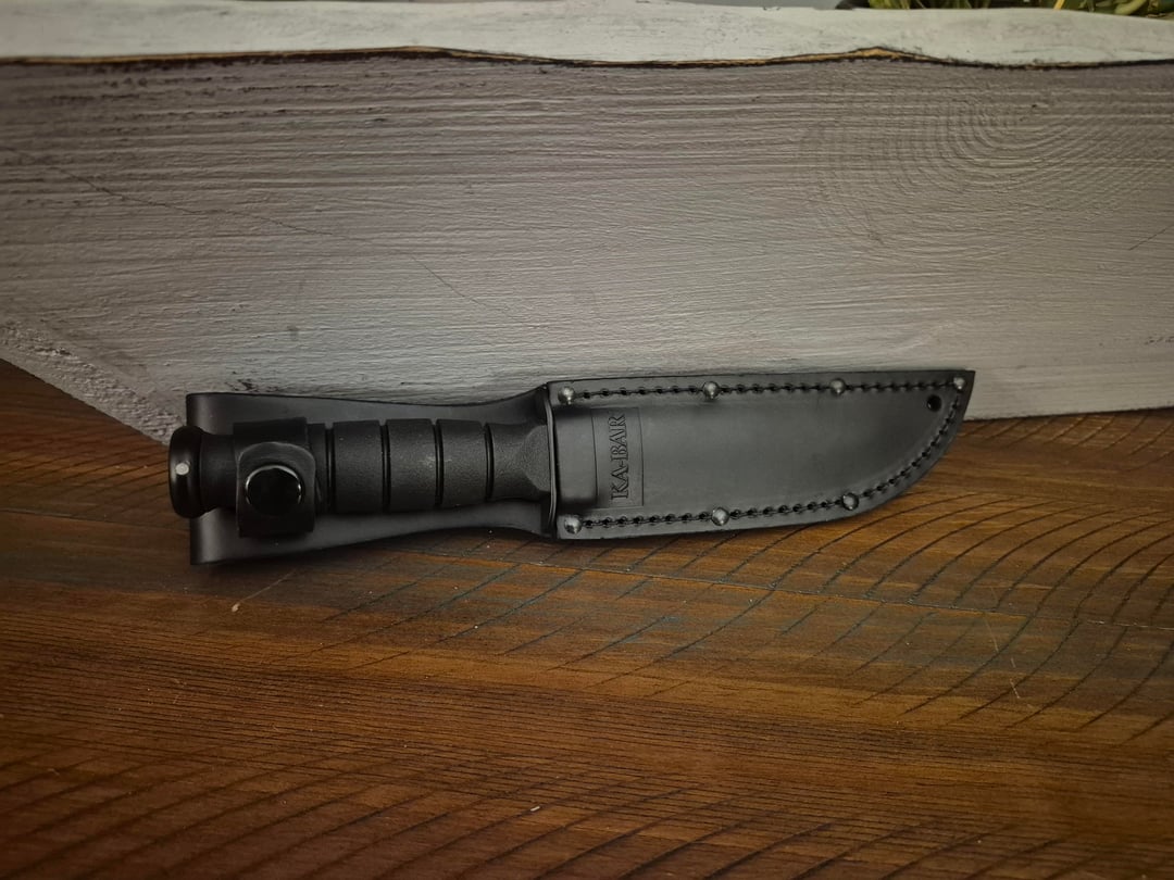 I found this Ka-bar Short for only $60 at some point. This one actually seems like a reasonable size at 5.25" compared to the big 7" knives. As always, I would have preferred the stacked leather handle but this rubber (kraton) one is comfortable and looks good too. The black leather sheath is nice as well.