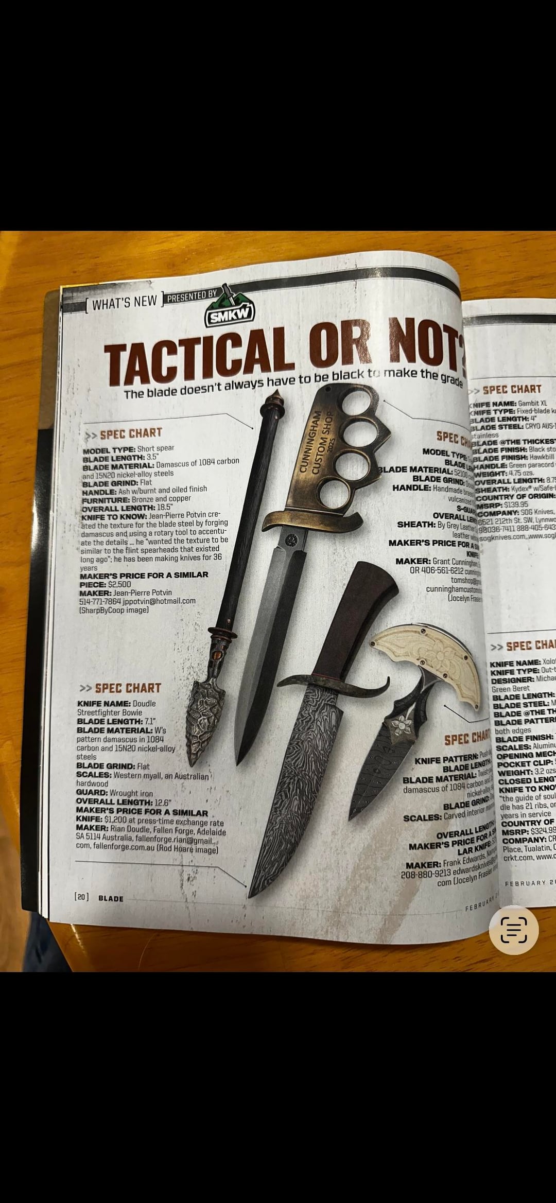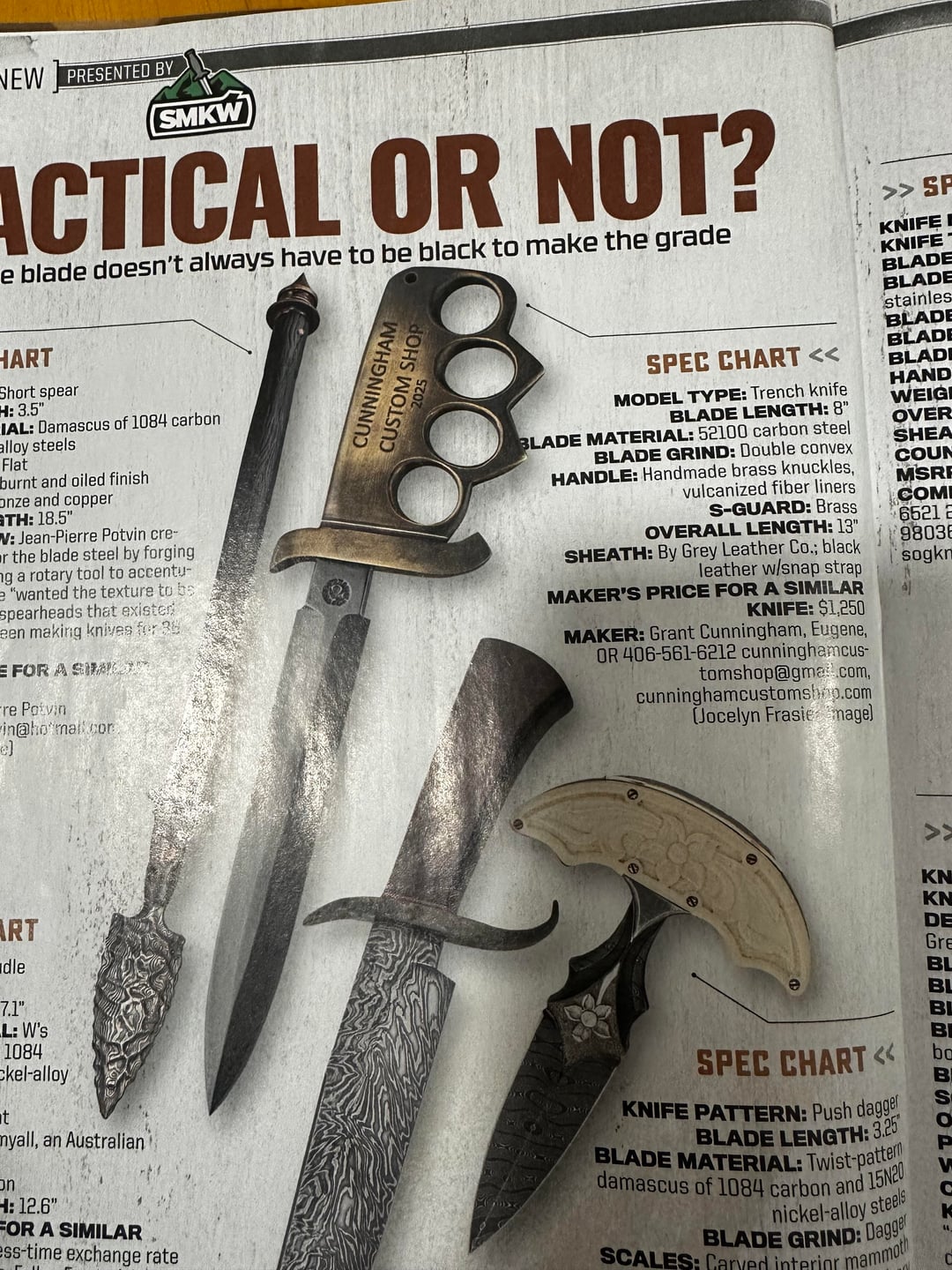I am honored and stoked (and completely surprised) to see my trench knife published in the Feb issue of Blade Mag. This is the first time my own work has made it to print and I can’t thank Jocelyn Frasier enough for her role in this. I am not sure how the editors go about selecting content, frankly I had no idea about it until a client congratulated me on this feature, and that itself was a treat. Wild stuff. Keep pressing on amigos, good things happen to those that hustle #CUNNINGHAMMER
