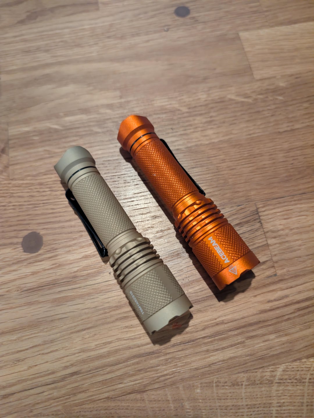 Just got this desert tan tac AA 2.0 and the finish is very different. It feels really rough and grippy, almost chalky feeling. The anodizing on my orange one (and all my other acebeam lights) is really slick. Hopefully you can see in my photos that the tan one barely reflects any light compared to the orange one. Does anyone else have any acebeam lights in this new desert tan colour and are they the same? I really like it but my wife hates the feeling of it