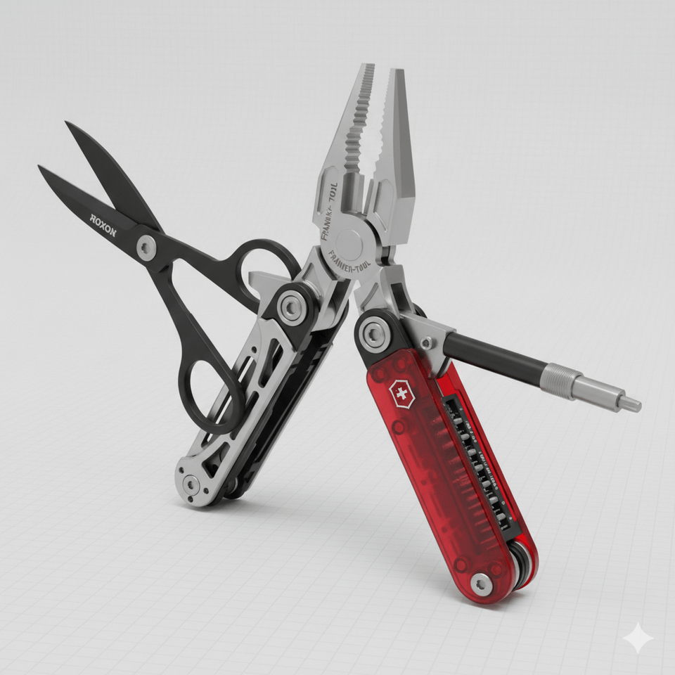 This first image is a really bad AI generation of my preferred multitool. A compact full sized head plier, a good sized pair of scissors skin to the Nextool flagship pro/ max. And a bit driver/ kit like the Victorinox cybertool.
