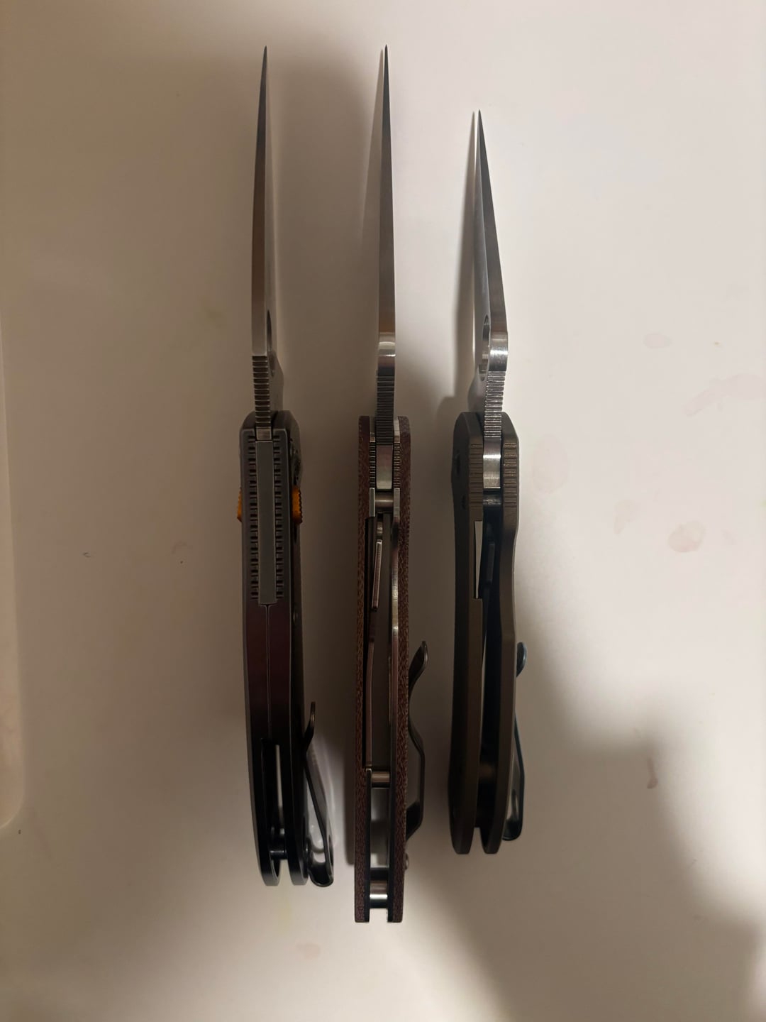 I suppose I’ll start with my least favorite, the Para 3. I own the lightweight version and out of the box there was some pretty glaring issues. This model only comes with one washer, leading to pretty significant off centering and bad action. This was remedied by putting on some awt scales, but it shouldn’t be necessary for the knife to perform well. The other major issue is the blade thickness. As the second photo really shows, it’s pretty thick for the size of the knife. This causes it to really drag and have a hard time cutting through anything substantial. That being said the size and hand feel is great, and its overall and amazing edc. The compression lock is probably my favorite lock, super fidgety and safe.