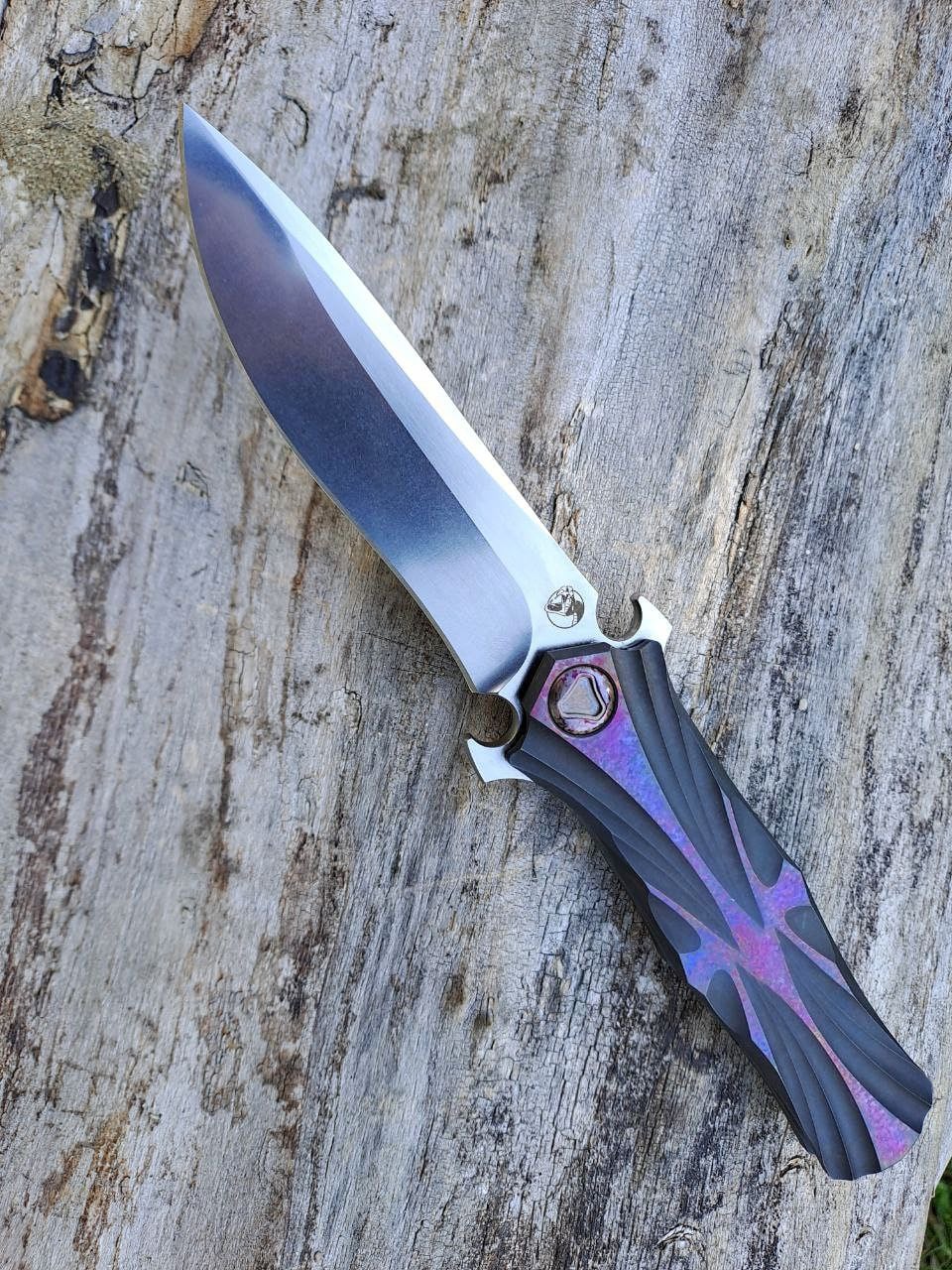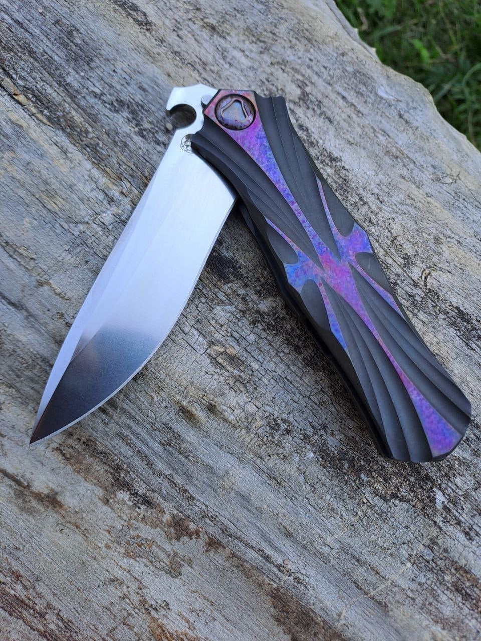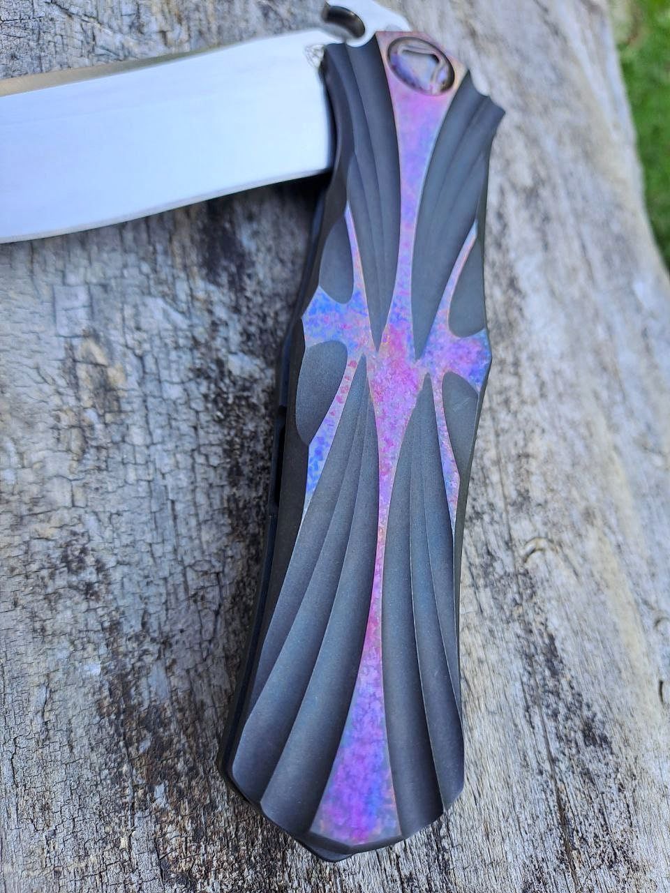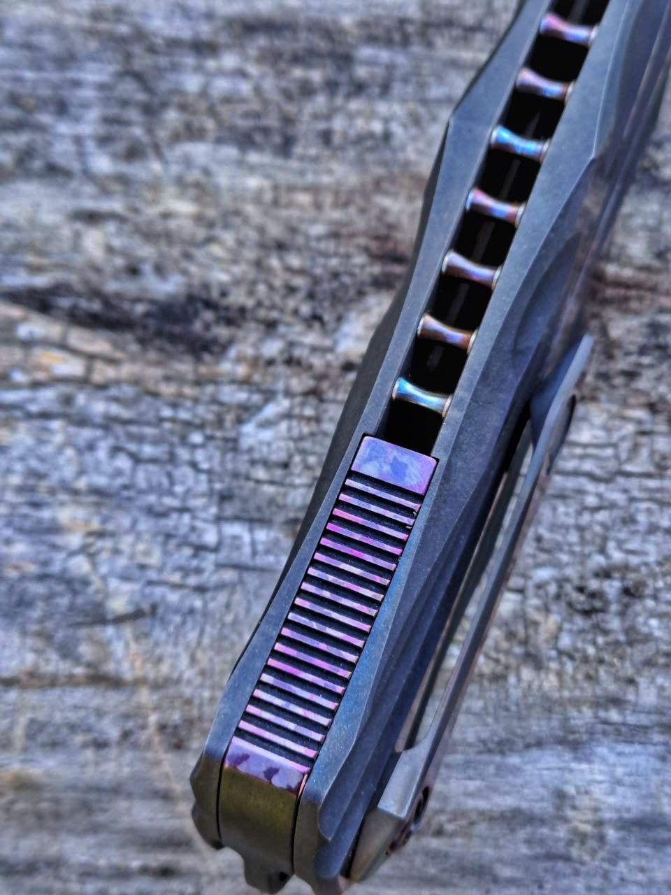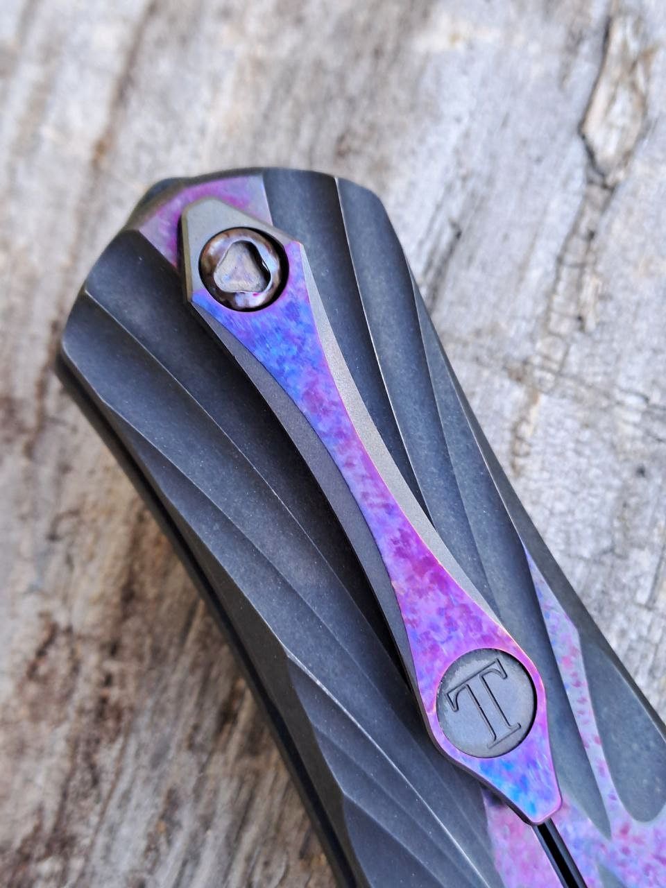 Sent it to my friend for a brief SPA, he blackened the handle with some acids, and made sure the top cross surface never scratches again. So he scratched it himself a million times, making nice pseudo CrystalTi surfaces (on the pivot and backspacer also). Little standoff pins are flamed.