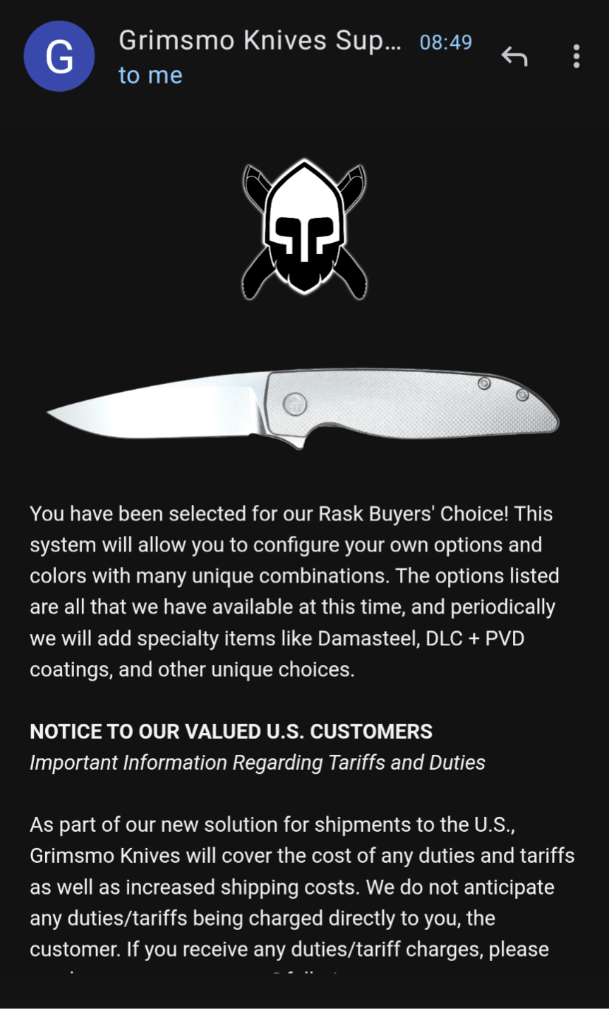 In KNIVES Anyone interested in a Buyer’s Choice Rask? January 14, 2026 I don't have funds at the moment, but I'd be happy to give someone who does, the link. Not asking for anything in return. Just DM me if you're interested. by jwoytk01 KnifeKnife ClubKnives Prev Post Today’s Grab January 14, 2026 Next Post I sanded my Kaweco Steel so the brand mark is no longer visible; I like the raw and simple style. January 14, 2026 Related Posts Black on black January 14, 2026 NKD January 14, 2026 Sebenza 31 Night Sky Damascus January 14, 2026 1 Comment mymillionthburner 2 hours ago Good lad! This will make someone very happy!Write A CommentYou must be logged in to post a comment.