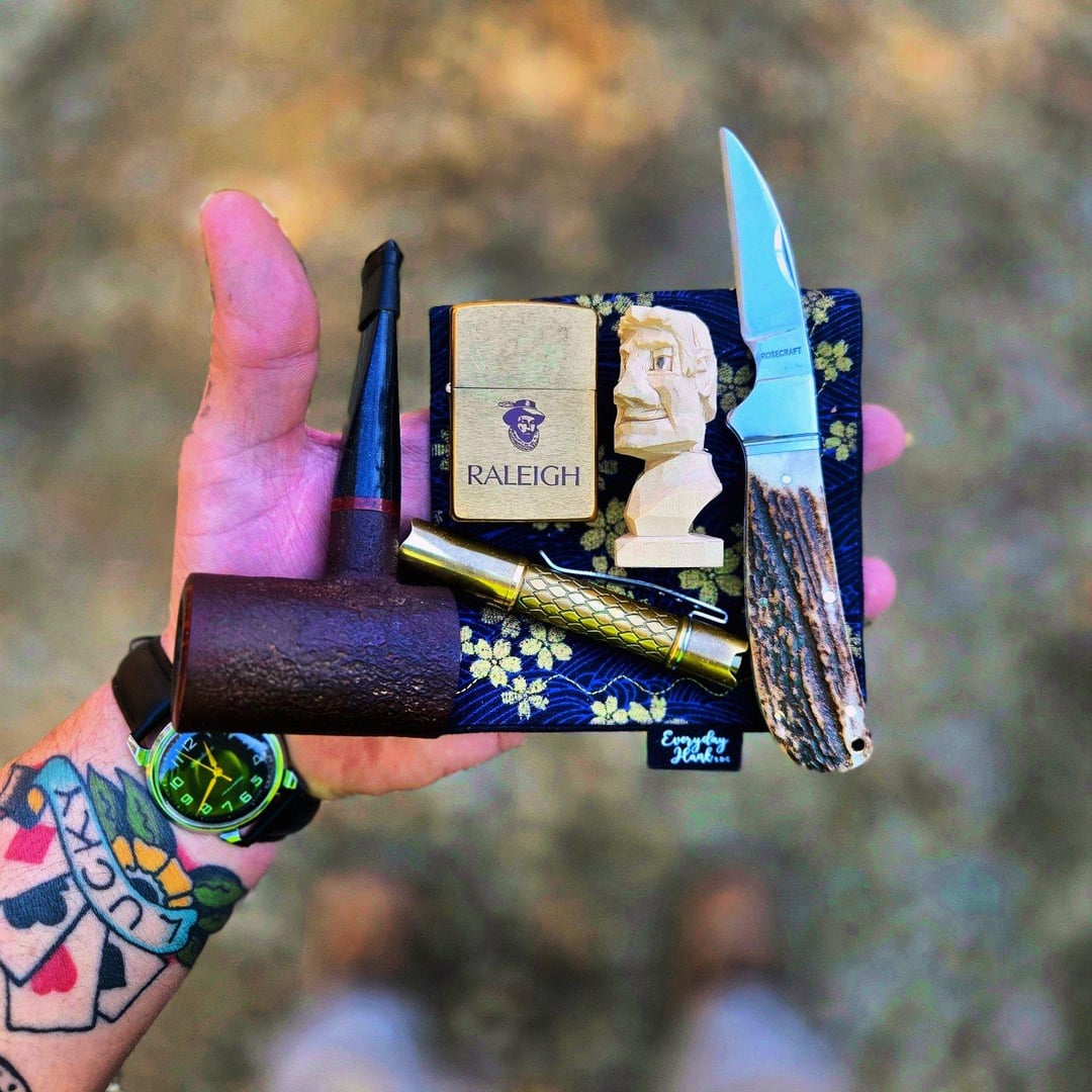 That pipe is a Paul Menard poker. Flashlight is a Reylight Brass Pineapple. Hank from EveryDay Hanks, knife is a Clinch River Swayback whittler from Rosecraft that i reprofiled to a straight up whittler. Zippo is a fun brass antique. The Watch is a vintage Kirovskie mechanical watch from the 1950’s. Its been serviced & is an absolutely fun conversation piece.