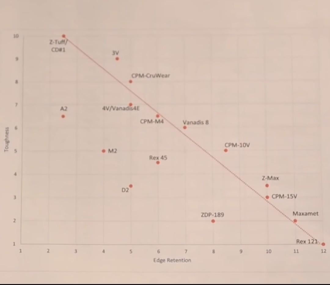 The article that accompanies the video has a lot more information, including a different version of these charts that shows toughness measured in foot pounds vs Rockwell hardness: https://knifesteelnerds.com/2021/10/19/knife-steels-rated-by-a-metallurgist-toughness-edge-retention-and-corrosion-resistance/