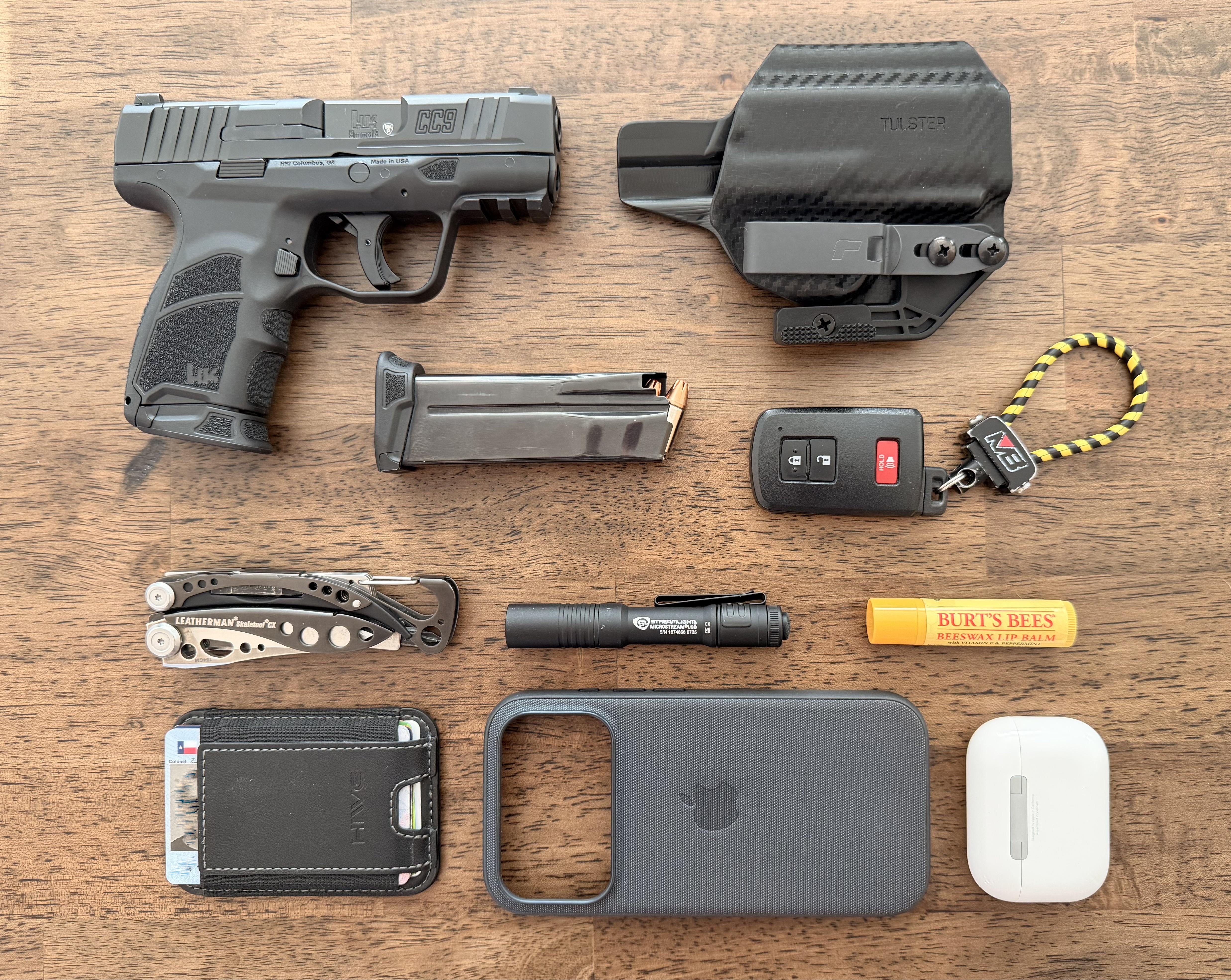 In EDC Jan 2026 EDC January 15, 2026 AIr Pods, iPhone 17 Pro, MagSafe wallet, Burt's Bees, Streamlight Microstream, Leatherman Skeletool CX, Vehicle key, HK CC9, Spare Mag, Tulster IWB holster, by Sasquatch_Mt_Project EDC Prev Post [NKD] Piranha Virus January 15, 2026 Next Post Early Birthday Present from my wife and daughter January 15, 2026 Related Posts Early Birthday Present from my wife and daughter January 15, 2026 He’s finally joined the family! My first 3-year-old skydiver! January 15, 2026 Here you go dirty Gunslingers! January 15, 2026 1 Comment AutoModerator 1 hour ago Thank you for posting to r/EDC! Include a detailed item list (make/model) within **1 hour** of submission. Lists can go in the title, a comment, or the image. Posts without lists will be removed. If you have already provided a list, not further action is needed, thanks | [FAQ](https://www.reddit.com/r/EDC/wiki/faq)*I am a bot, and this action was performed automatically. Please [contact the moderators of this subreddit](/message/compose/?to=/r/EDC) if you have any questions or concerns.*Write A CommentYou must be logged in to post a comment.