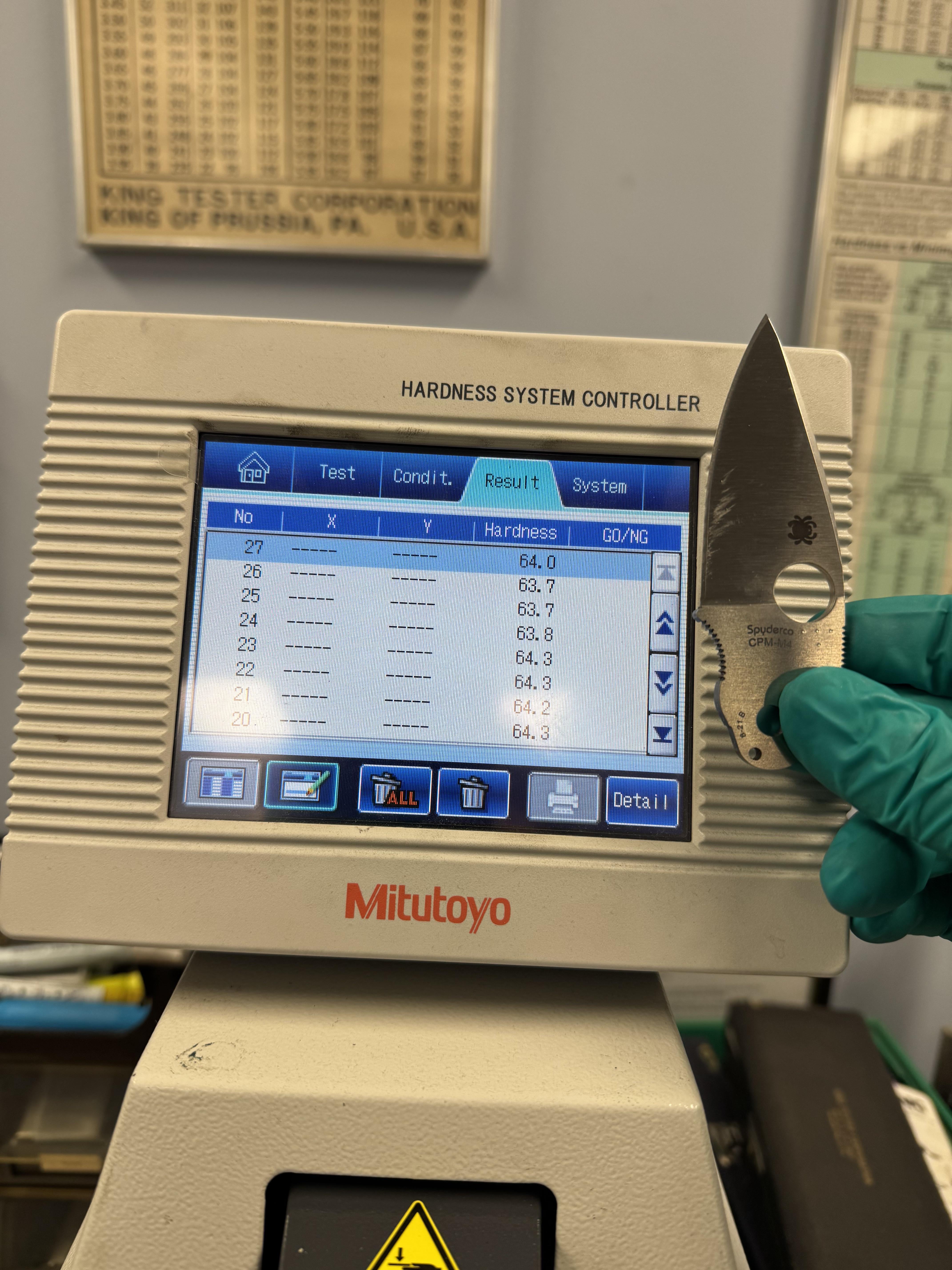 Verified on a 62.7 HRC Verification Block. Blade is dated 8-21. Please take not that the first 4 punches are about half a point higher on average. This is precisely why you cannot simply test one side of a blade. You absolutely must take an average between both sides.