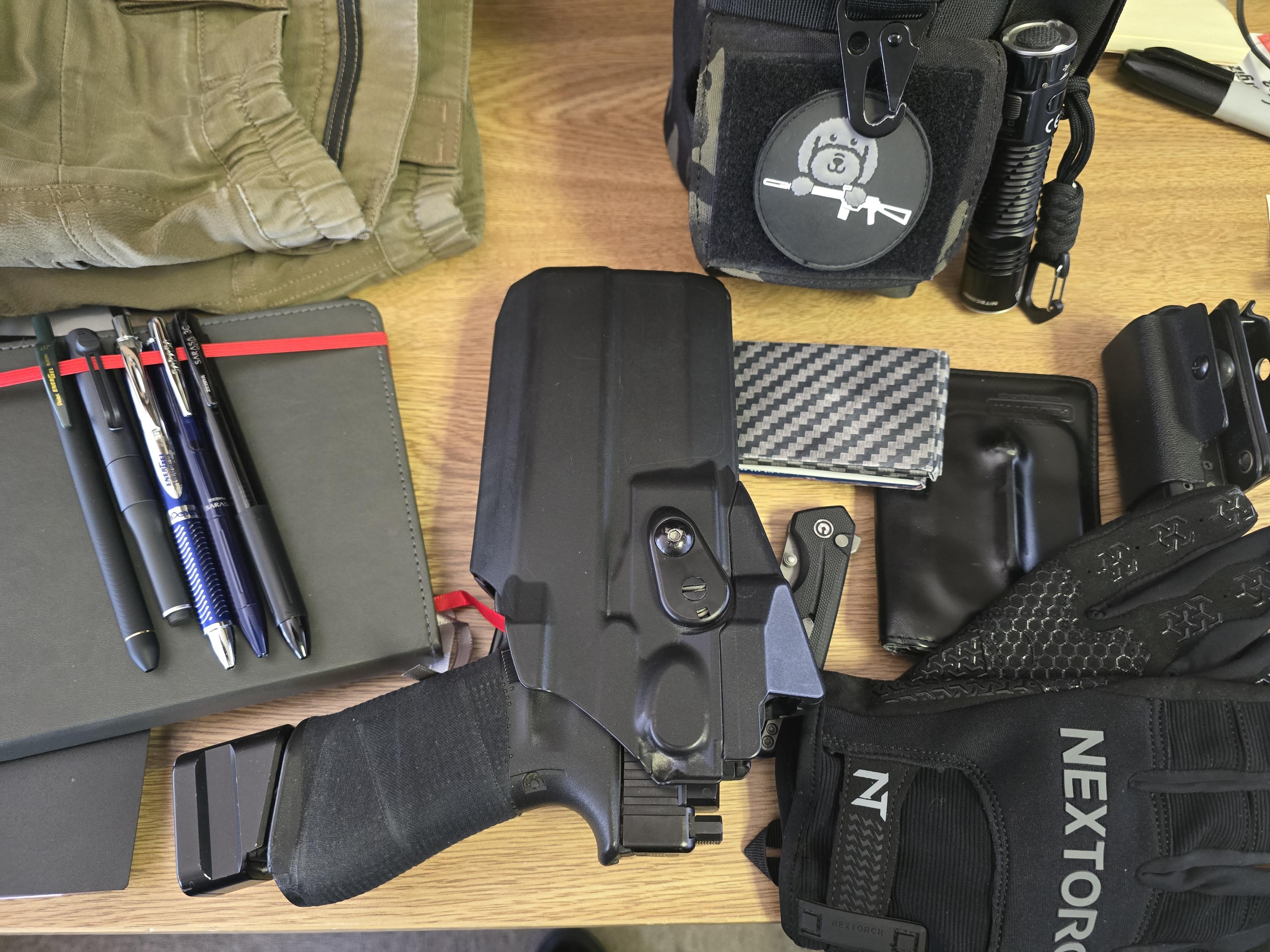 Glock 17, Civivi Tarask, Paperwallet, Creds Wallet, Nextorch Tactical Gloves, Spare Mag, Nitecore EDC 33, Battle Bottle, UF Pro Pants. Notebook and some of my favorite pens. Pic taken when switching out uniforms.