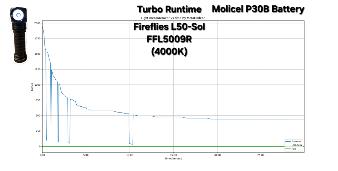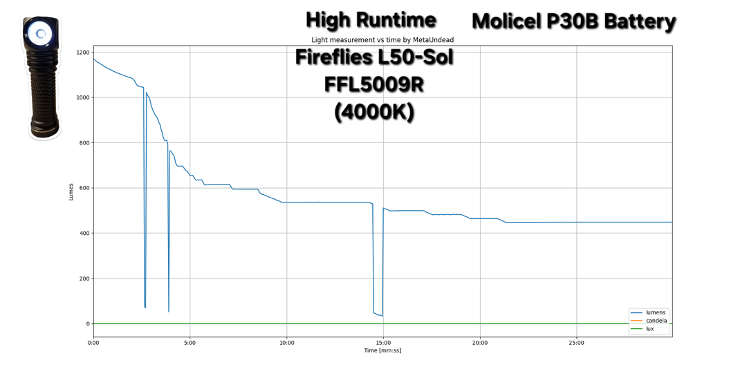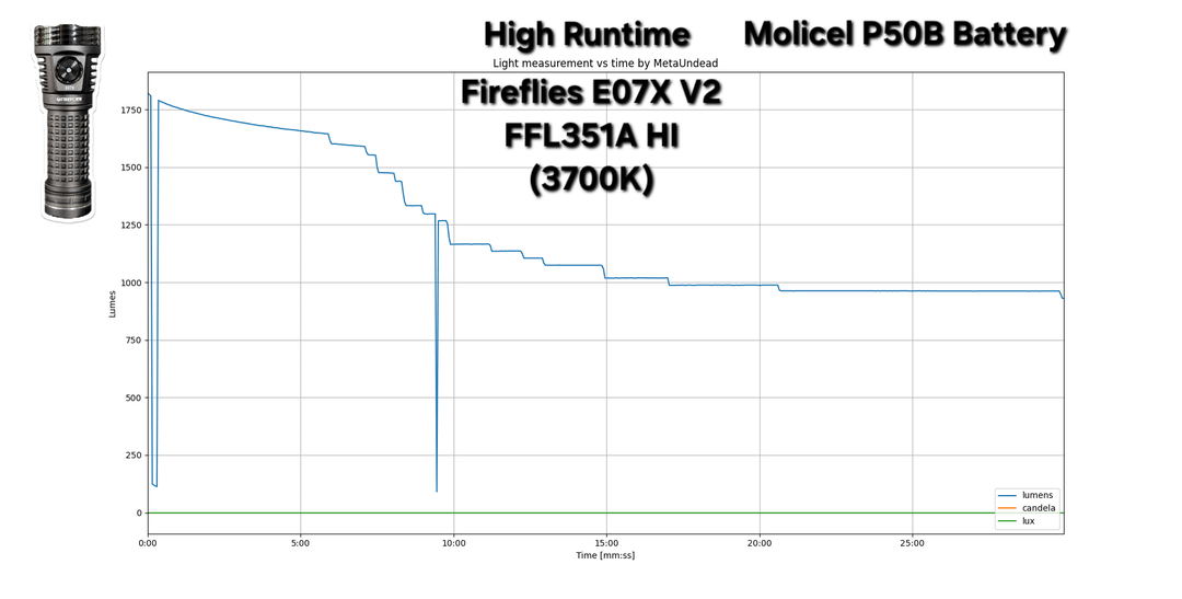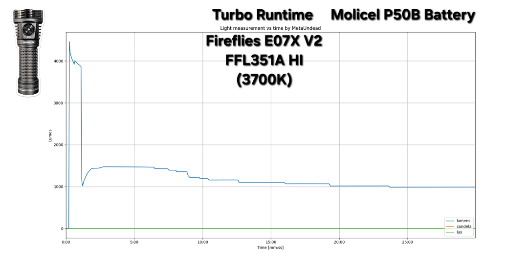 In Flashlight 30min Turbo & High runtime measurements of Fireflies E07X V2 FFL351A HI (3700K) & L50-Sol FFL5009R (4000K) January 16, 2026 Don't mind the dips in the readings, it's a measurement issue with my new tester and not a reflection of the lights performance.Hopefully, I'll be able to sort it out.by MetaUndead flashFlashlightlight Prev Post Today’s carry. January 16, 2026 Next Post NKD! Extrema Ratio Glauca G1 January 16, 2026 Related Posts The obsession is growing. January 16, 2026 Convoy M21B after field testing, not a shelf queen January 16, 2026 FFL L50 SFT70 3000k MAO vs Fenix HM61R Amber January 16, 2026 1 Comment BangCambe 2 hours ago i’m more curious to see X4Q, X4 stellar VS D4K. since their size almost identical, hope u have time to make one.Write A CommentYou must be logged in to post a comment.