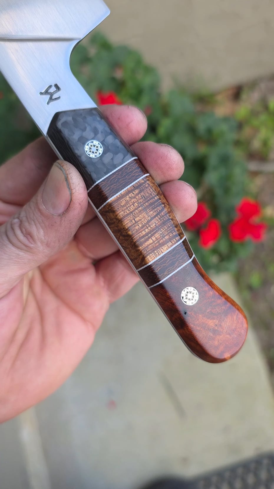 AEB-L Stainless with Amboyna Burl and carbon fiber handle with carbon fiber. The split is made with Curly Koa and burlap Micarta. White G10 liners and mosiac pins. 🤙