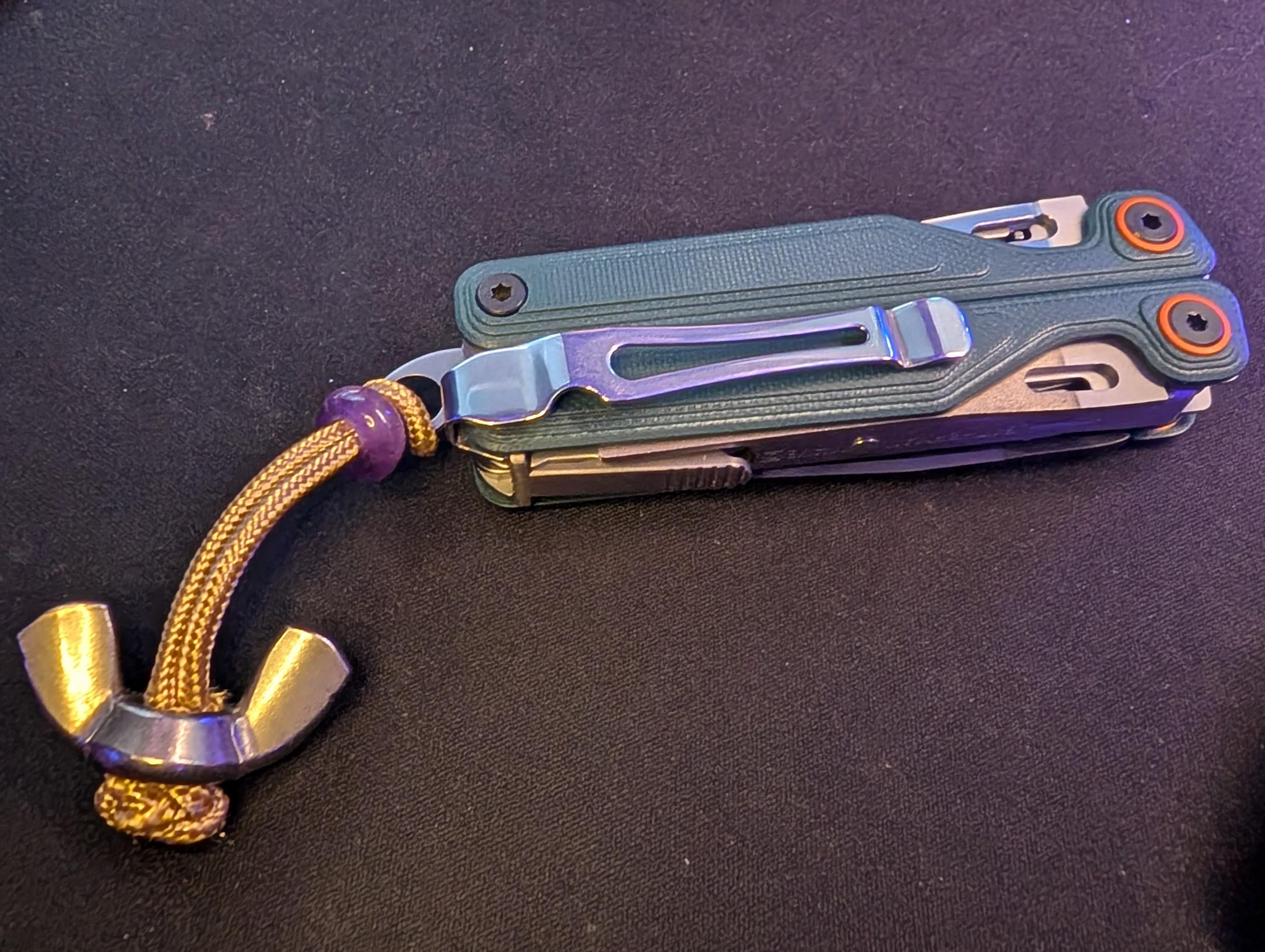 I was looking online at the crazy prices of the lanyard beads so I decided to browse around the shop and see what I could use instead of the obvious. Turns out the wing nut is already my favourite lanyard addition. I can hang the wing nut on the edge of my pocket (only on the leatherman for testing rn; yes I know I have a belt clip on there too), or on a thin rope tying down a tarp while camping for example. I've got a thick work coat with deep top flap pockets on the front that it hangs perfectly in as well. Also is nice for an easy two finger pull if it's just hanging while using the belt clip. Gonna start thinking more unconventional for lanyard beads/charms going forward, already hit paydirt on this one IMO.