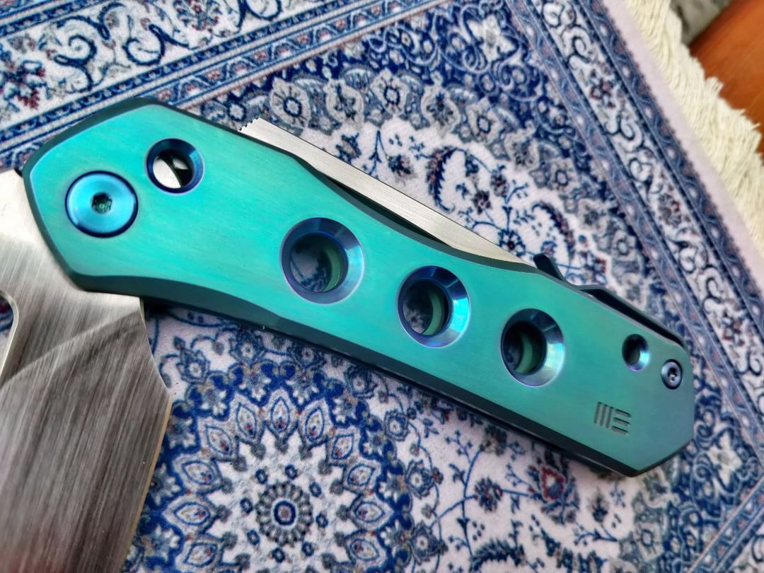 The handle was satined, anodized aquamarine with mirror polished accents in the round holes.