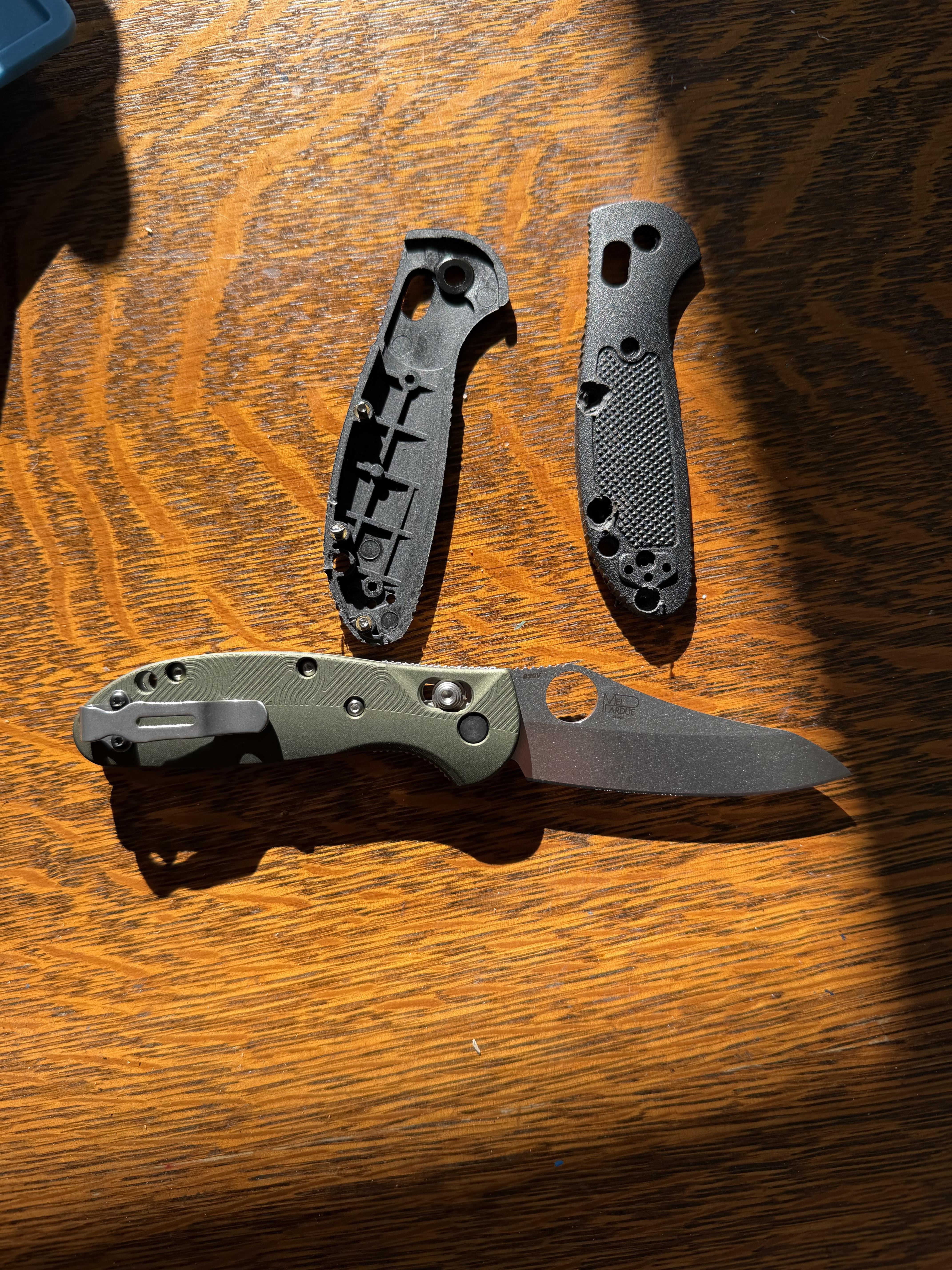 Swapped some aluminum flytanium scales on my mini grip. 3/3 body screws were overtightened beyond loosening with heat and the proper torx bit, so I restored to the old brrrr.