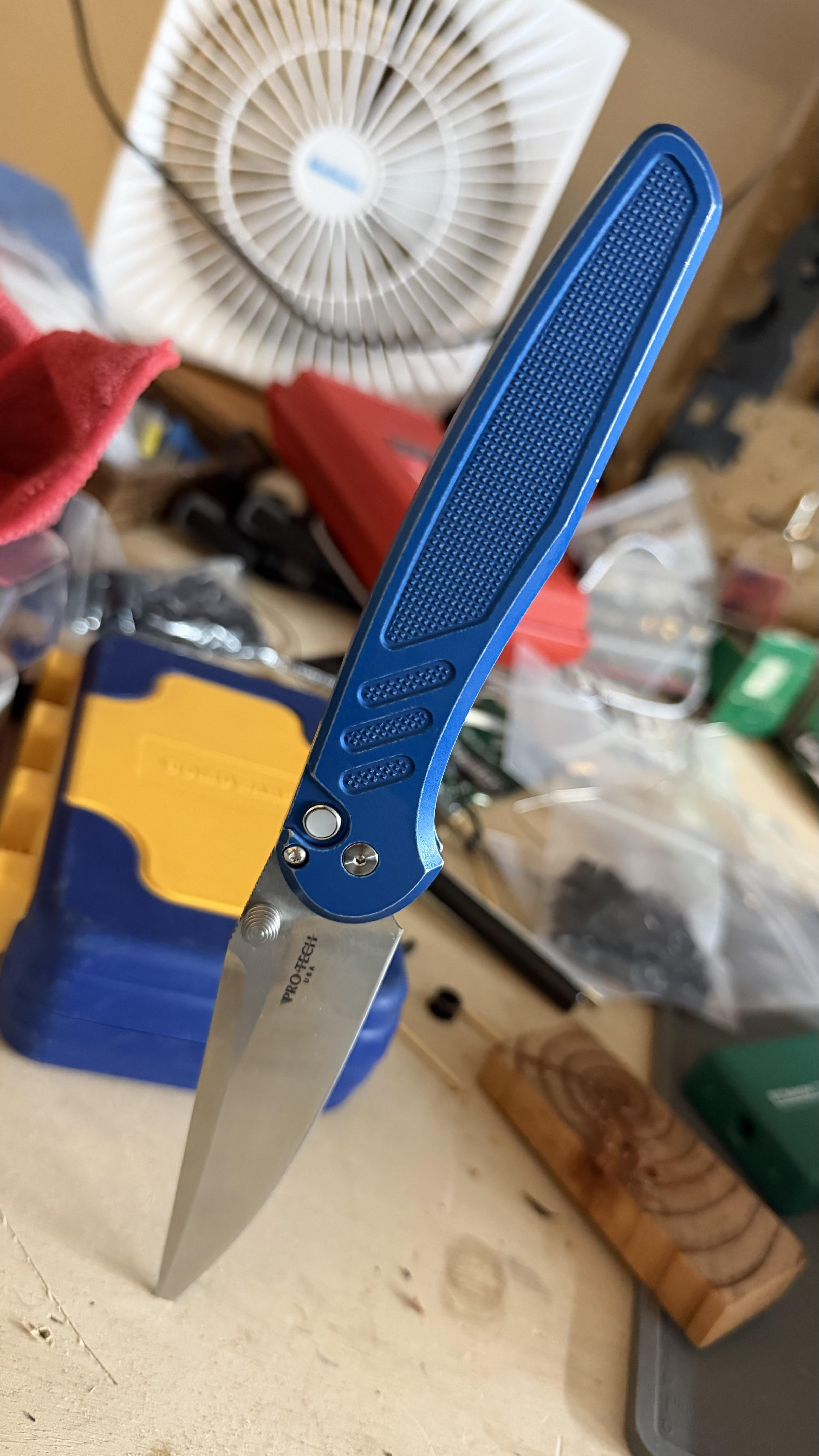 This is the Facebook group exclusive protech Avalon, designed with Shawn Ashmore’s company Peace Neighbor. Four inches of magnacut, blue scales, MOP button. Regular version will be black, and a Mike irie version in 154cm is also coming. Awesome pig sticker of a knife!