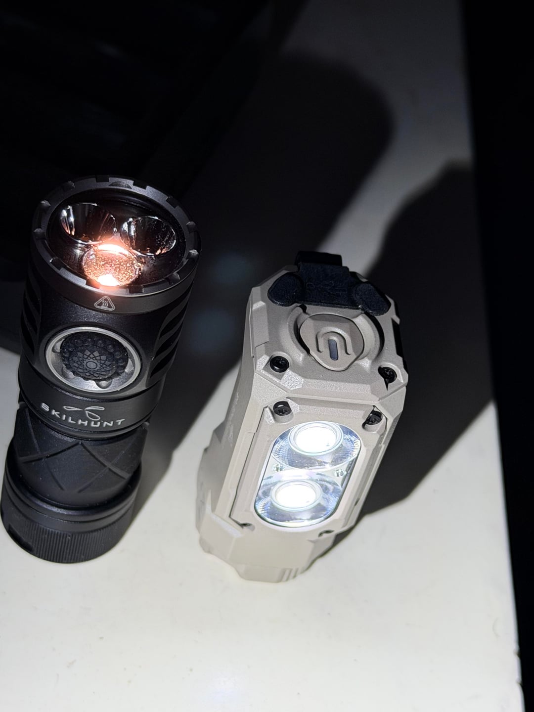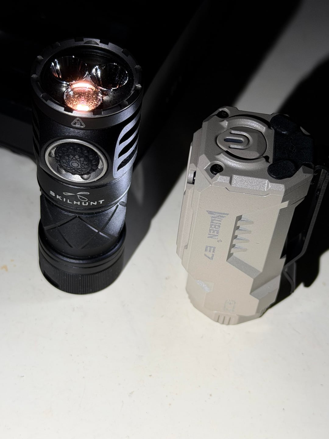 The skillhunt with 2 different color temps 519a nichia and the Wuben e7 the wuben e7 pushes 1000 lumens even when the battery is dying I don’t know how it does it no madder how hot it gets it pushes turbo over and over and over and never breaks a perfect flashlight for bright emergencies that can fit in your pocket the skillhunt has got that warm white high cri with now a 1600 mah battery and the skillhunt now has a 1600 mah 18350 maxed out. The skillhunt hunt e7 doesn’t play games it works hard and hot and doesn’t give up no madder how many times you turbo it. Good for emergencies