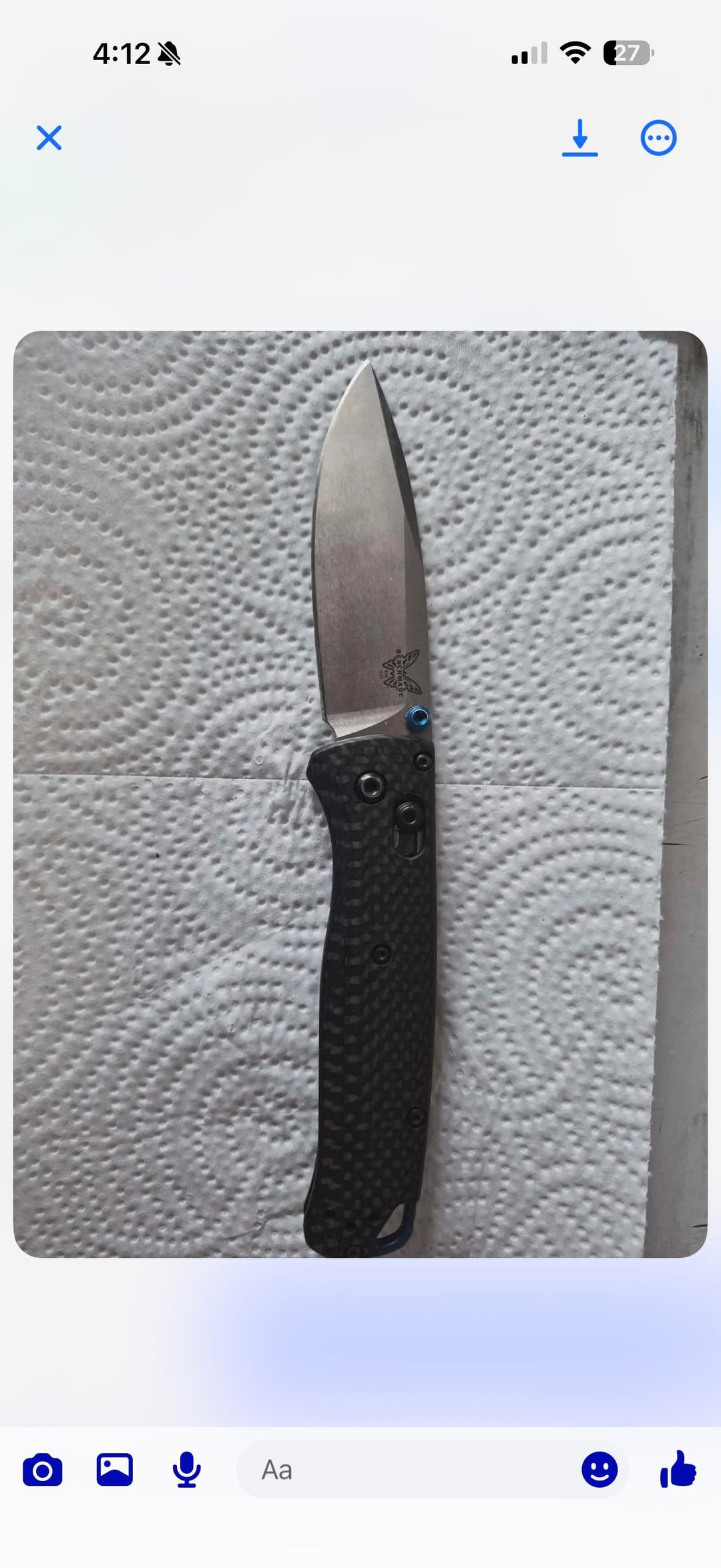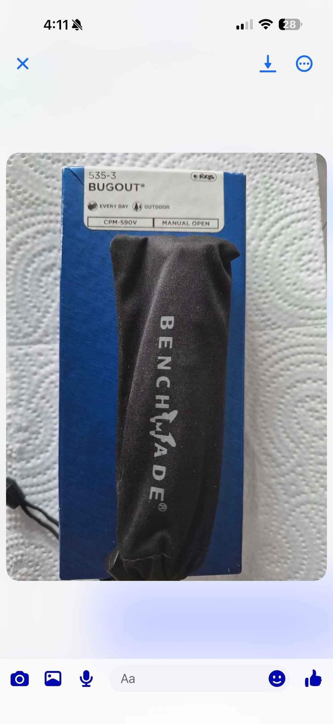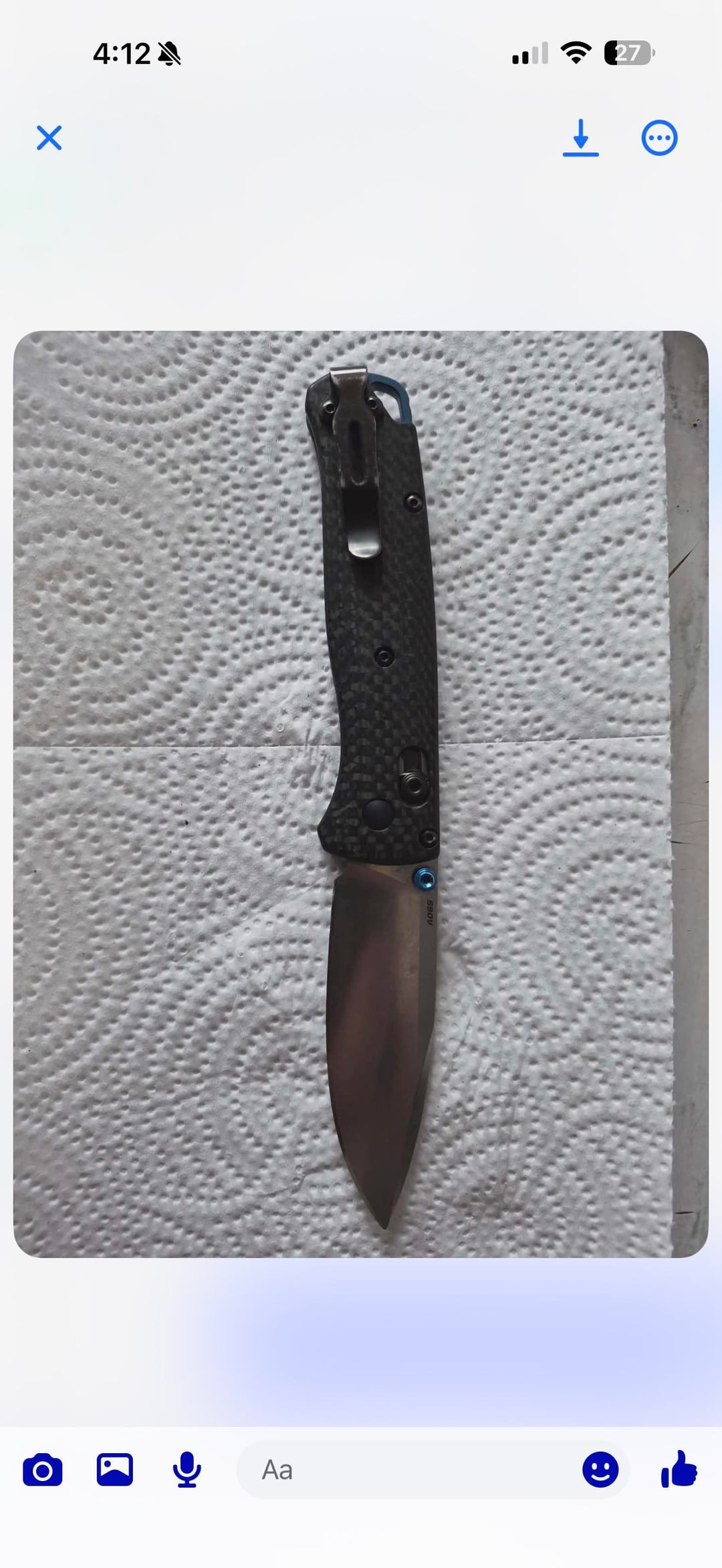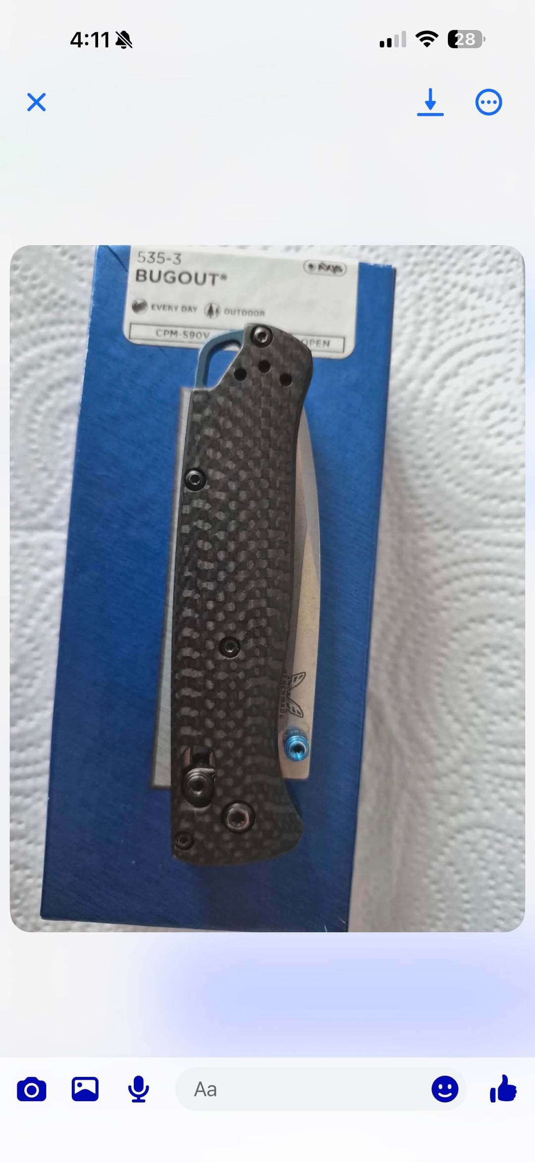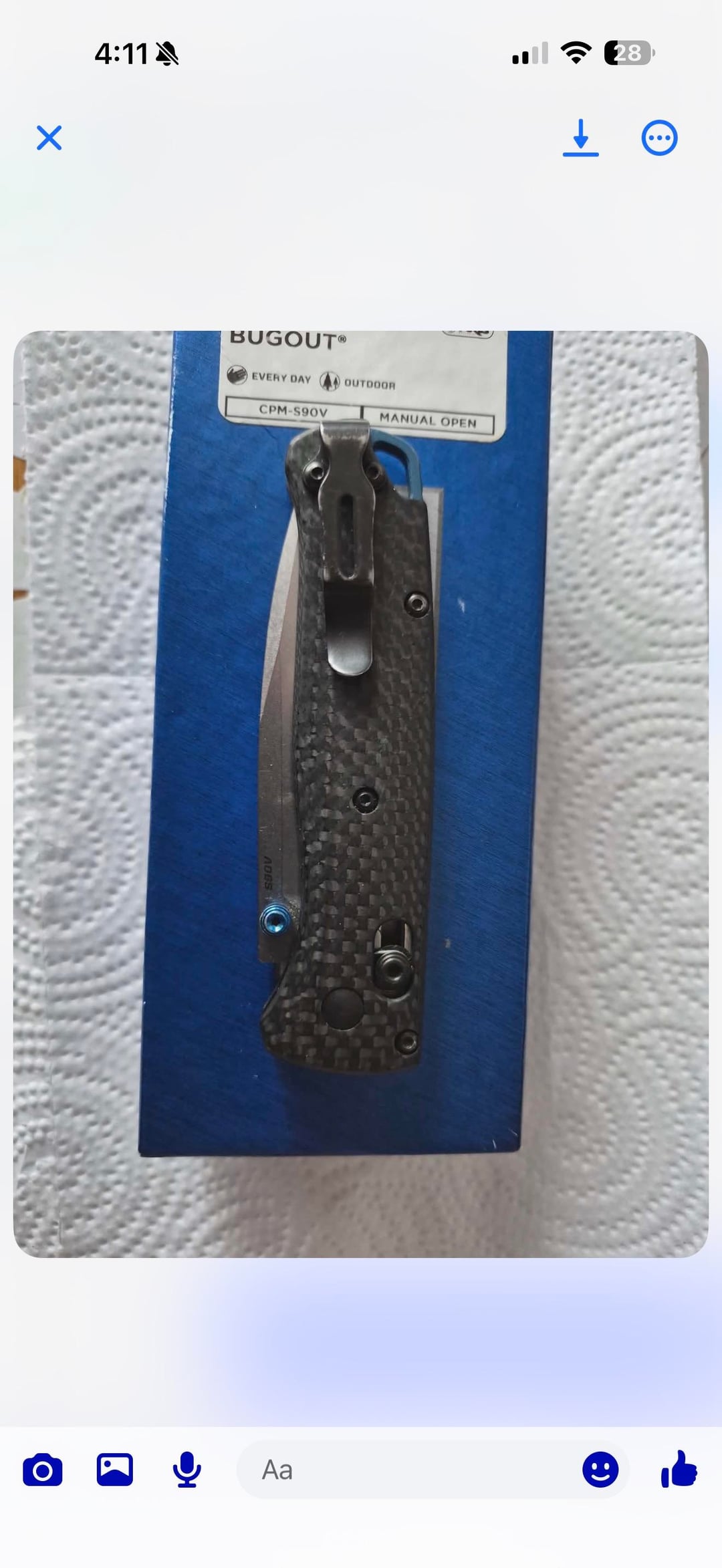 The one in the picture appears to have a bit of wear on the thumbstuds and clips. And the knife appears to have been sharpened by the owner based on the bevel. So take that into consideration on if you wanna purchase this one. Even though they cost $350 new, I would look for a Bugout in better condition unless i’m betting a really good deal like $150 or less.