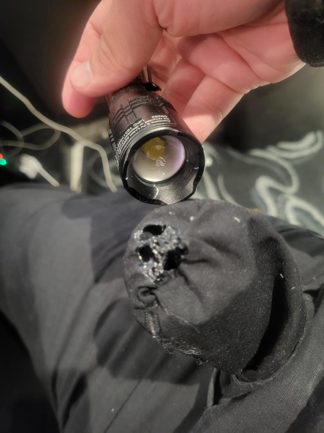 At some point while working, this flashlight turned on in my pocket and not only burned holes into the pocket, but was hot enough it damaged itself too.