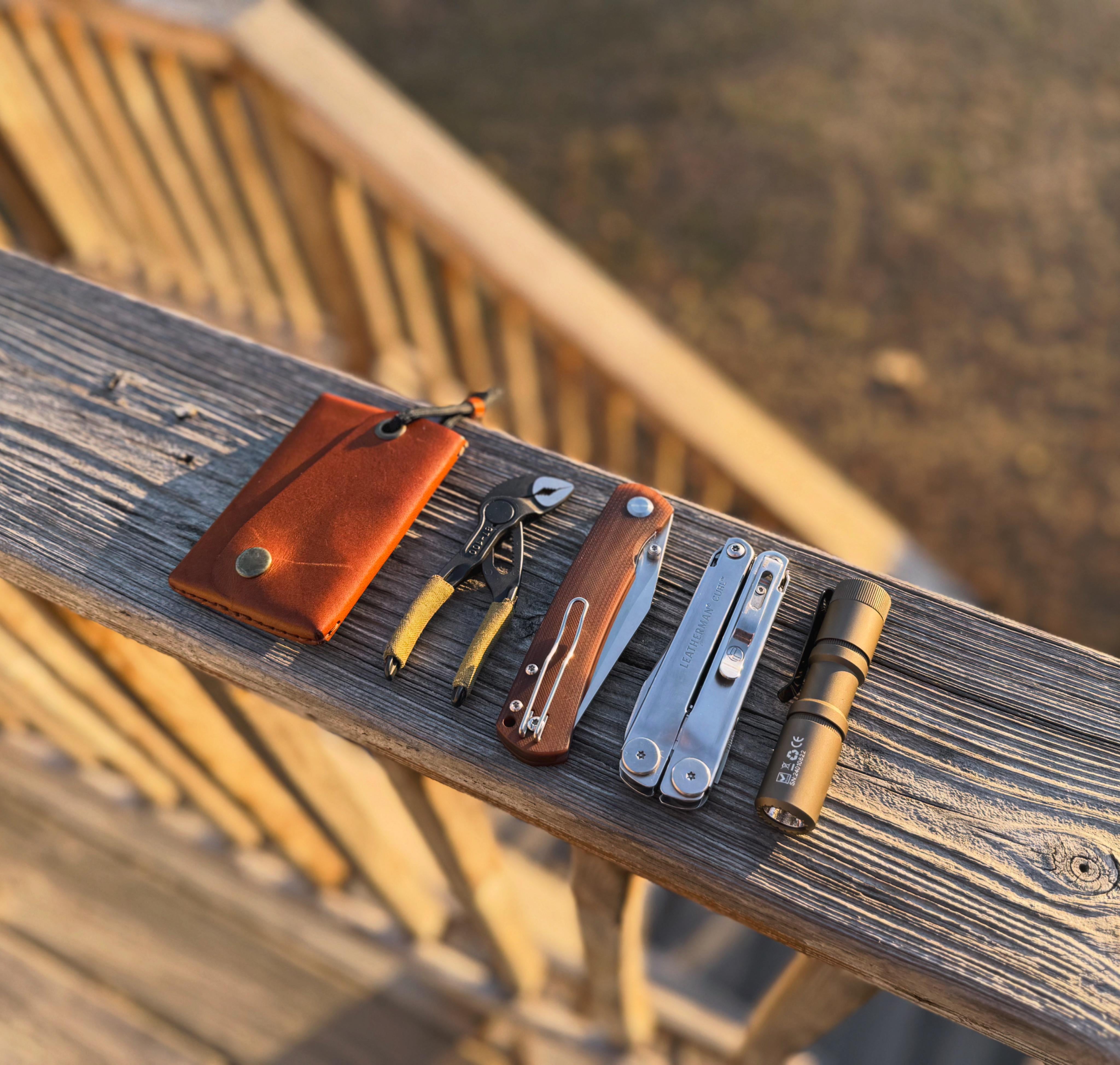 Storksbeak Leather wallet, Knipex pliers, Monterey Bay Old Guard (dyed), LM Curl, Manker E05 2