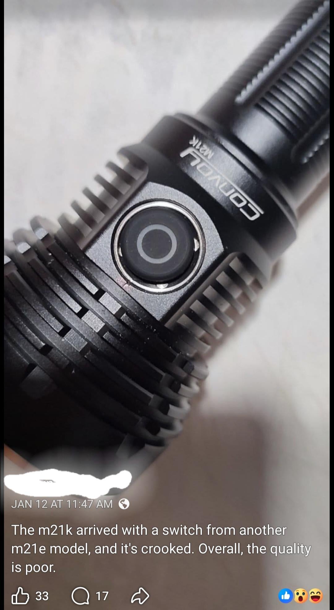 I kind of agree that the button should match the listing photo,(but I think the one shown in the photo you linked looks better) but I’m sure it works fine either way, and I just noticed that Simon released a bunch of new stuff that I’m gonna go look at. (S21E tactical tail switch, so now I don’t need so buy the s21a just for the tail, but at the cost of not color matching)