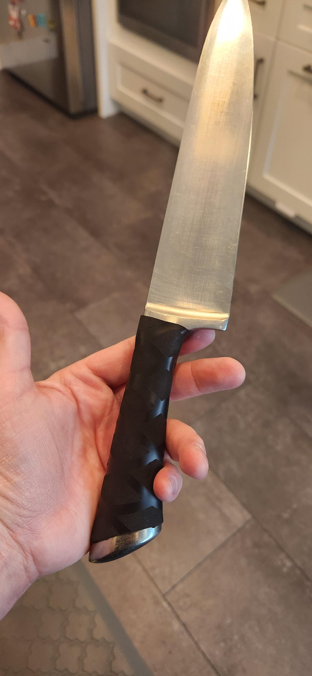 My friend had some large shrink tube that is used for fishing poles. I put a piece of it over the knife handle, used a heat gun to shrink it, and trimmed the excess with an exacto blade. I think it will work well and I like the texture for grip control. my only concerns are water or other liquids getting under it and creating something unsanitary (it's a kitchen knife) and the fact that it was hard to trim the edges perfectly clean. I guess we'll see how it holds up over time. worst case scenario is it doesn't last long and I'm back to square one.