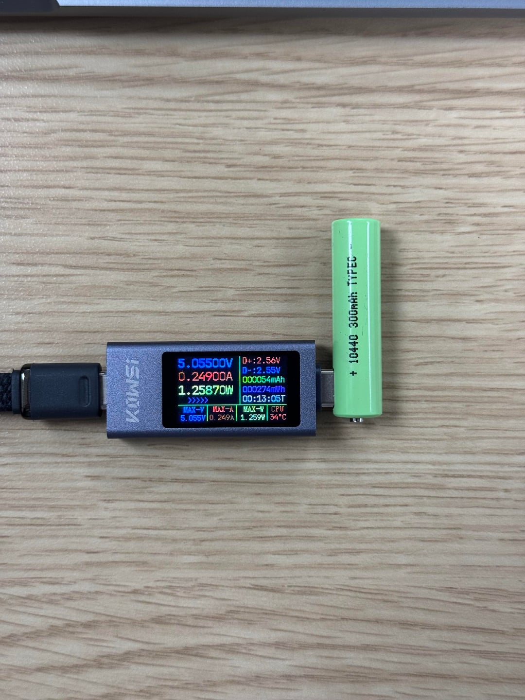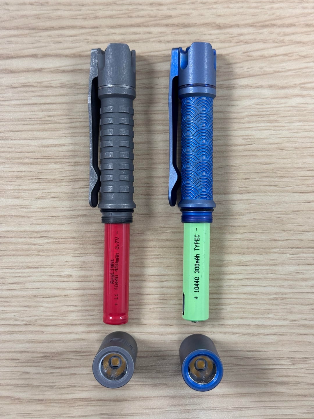 As a pleasant surprise, neither of my lights came with the 350mAh 10440 battery that the description says they do (see pic 3). My first one arrived with a ReyLight-branded 450mAh flat top 10440 cell which I tested to have a 408mAh capacity. I can’t find any info on this cell, and it doesn’t seem to be available on ReyLight’s website or AliExpress…cool to have a little extra capacity nonetheless though. The second one came with the 300mAh USB-C rechargeable 10440 cell from ReyLight’s website. I haven’t capacity tested it yet but it recharges at 1.25W, or about 1C, meaning a full recharge should take about one hour. I didn’t order either cell separately, and was secretly hoping I’d get another one of the 450mAh mystery cells with my second order, but I’m sure the USB-C recharging will come in handy at some point.