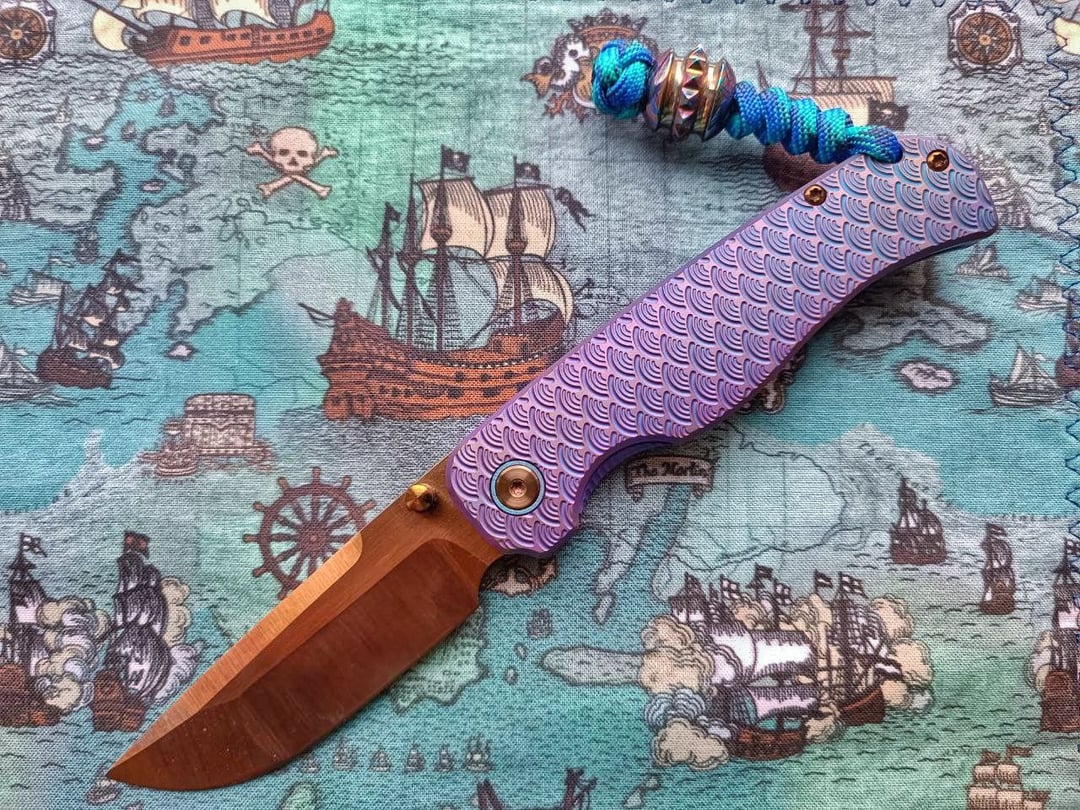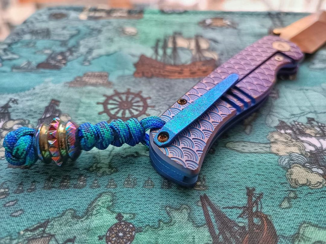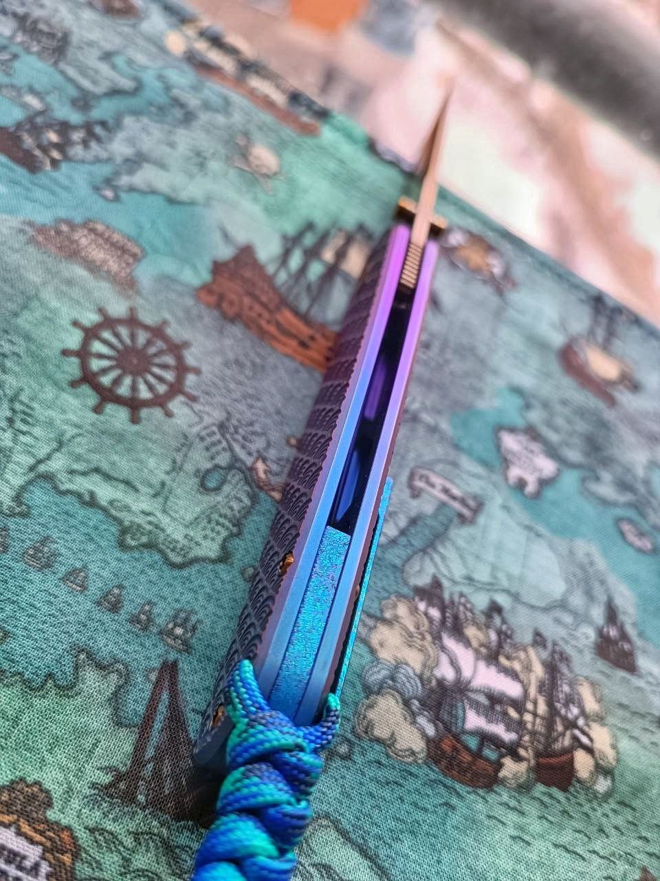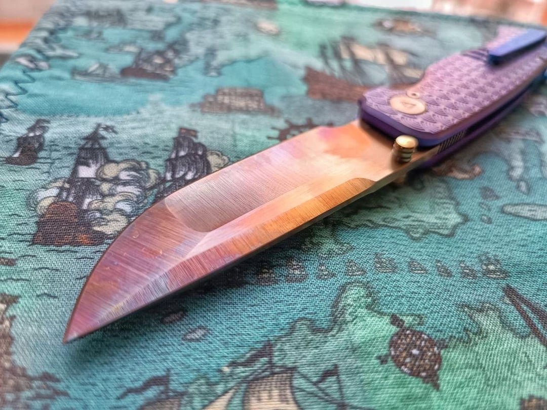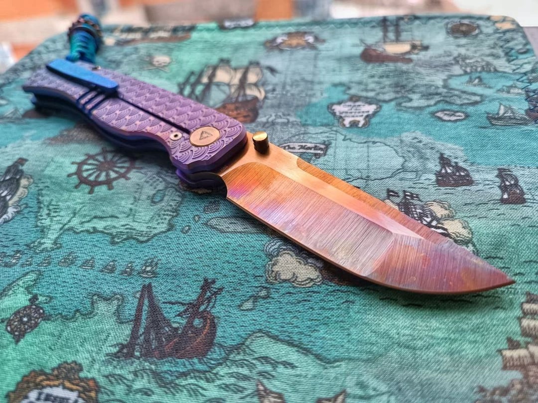 Sent it to my friend to give it a SWAG look. Purple-blue ano on handles with hints of pink and gold, and amazing stippling and etching work on spacer and clip – it has depth and is pearlescent with neon colors. The blade is also lightly treated with laser, giving it a sunset look. Hardware flamed to bronze. A bit of an overkill, but sometimes you have to go full nuts. And yes, it still cuts, the heat didn't turn it into a wet noodle.