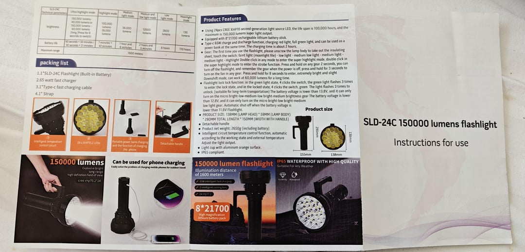 I’m just reading the instruction manual right now and supposedly it can sustain 100,000 lumens for a whole 7 minutes 😳