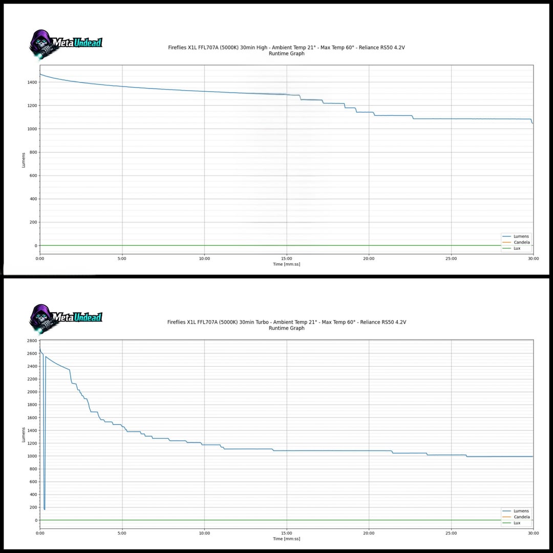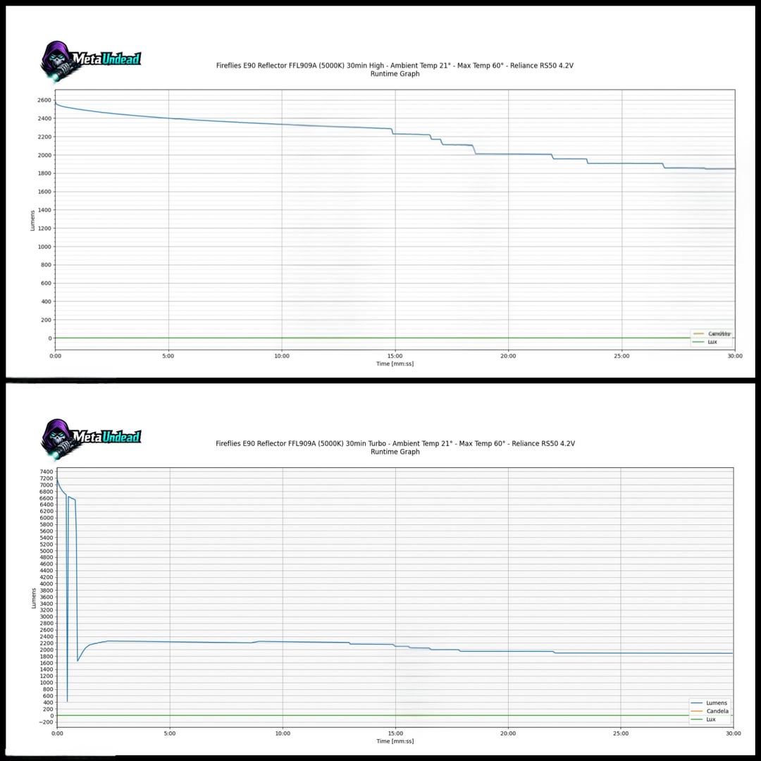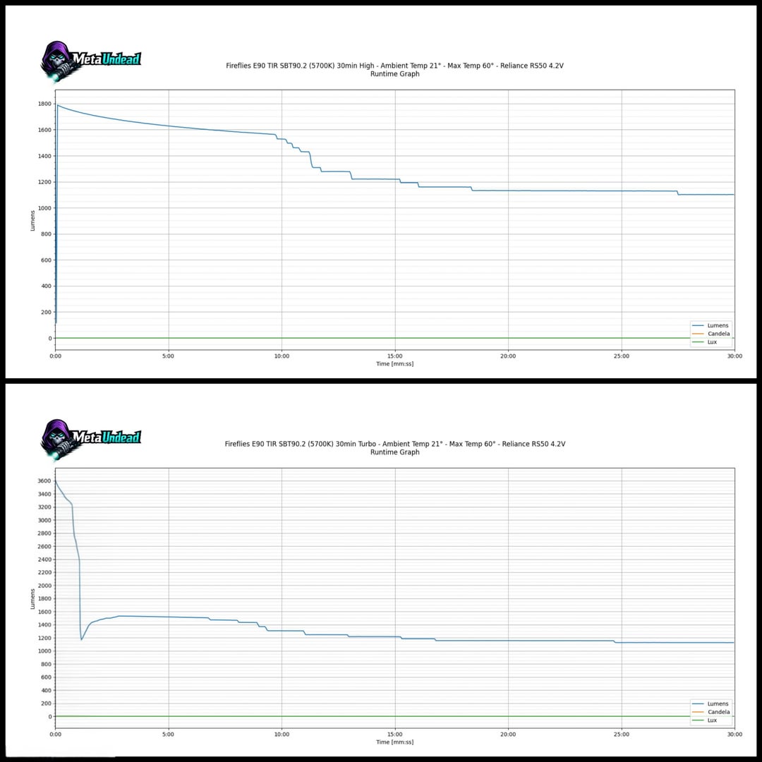 The standout performer has to be my Fireflies E90 (FFL909A 5000K, OP reflector). While the turbo is short-lived, its sustained output is around 2000 lumens, which blew my expectations out of the water.