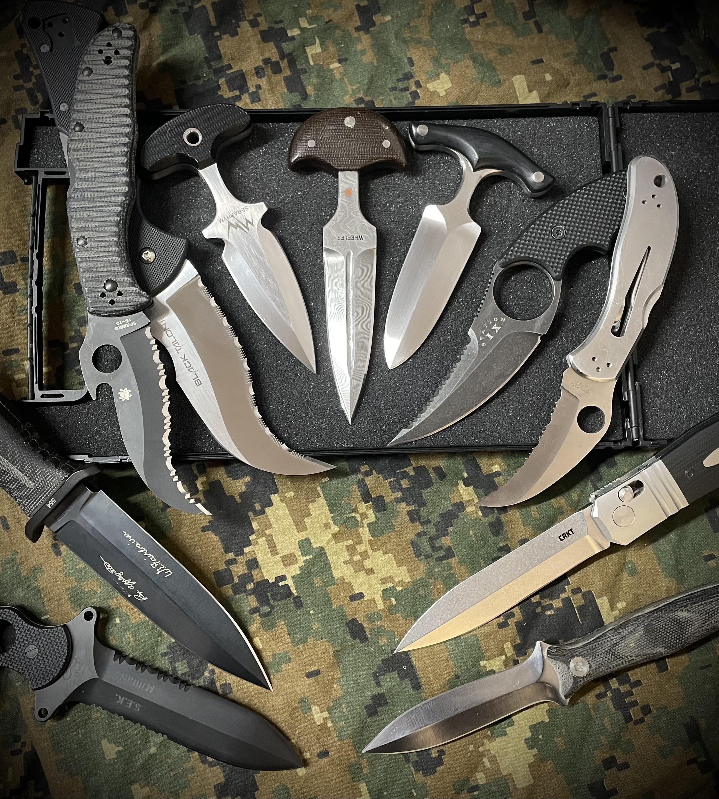 Left to right: Eickhorn SEK-M, Boker A/F Harsey, Spydie Matriarch, Cold Steel Black Talon II, Mercworx Seraphim, Gary Wheeler push dagger, BTR custom push dagger, Station IX No. 5, Spydie Harpy, CRKT Redemption, and Ek (P7?) boot knife.