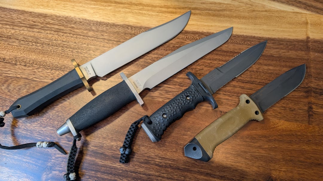 The BMF was my first hardcore bush knife, purchased at a gun show in the late 80s before I was even old enough to drive. It's seen heavy use over the years but is still in amazing shape. I've used the LMF II as a bushcrafter quite a bit over the past couple decades since it's release as well. It's another knife I've abused quite a bit and has really held up. On the other hand, the Aussie and Silver Trident have lived their entire lives as safe queens.