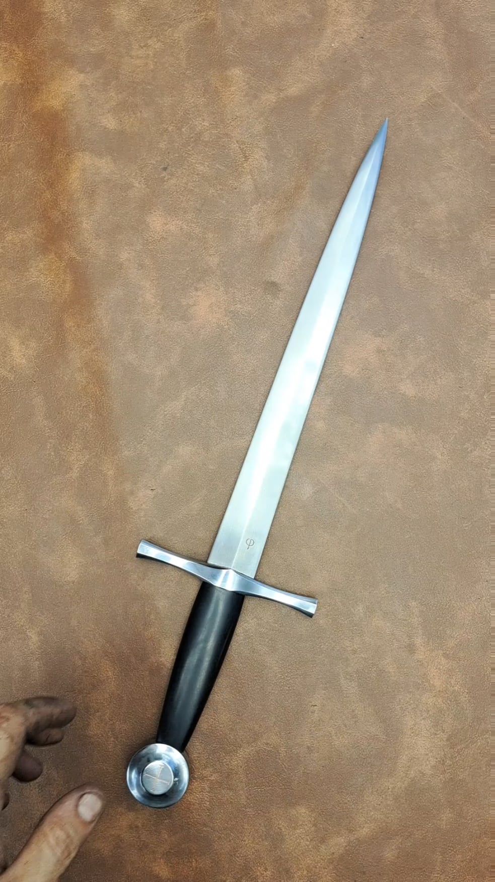14th-century knight’s dagger inspired by a historical example. The blade is made from 1070 steel, with the guard and pommel constructed from 5160 steel, featuring a copper inlay of a crossed cross on the pommel. The handle is made from Gabon ebony. Comes with a leather-covered wooden scabbard.
