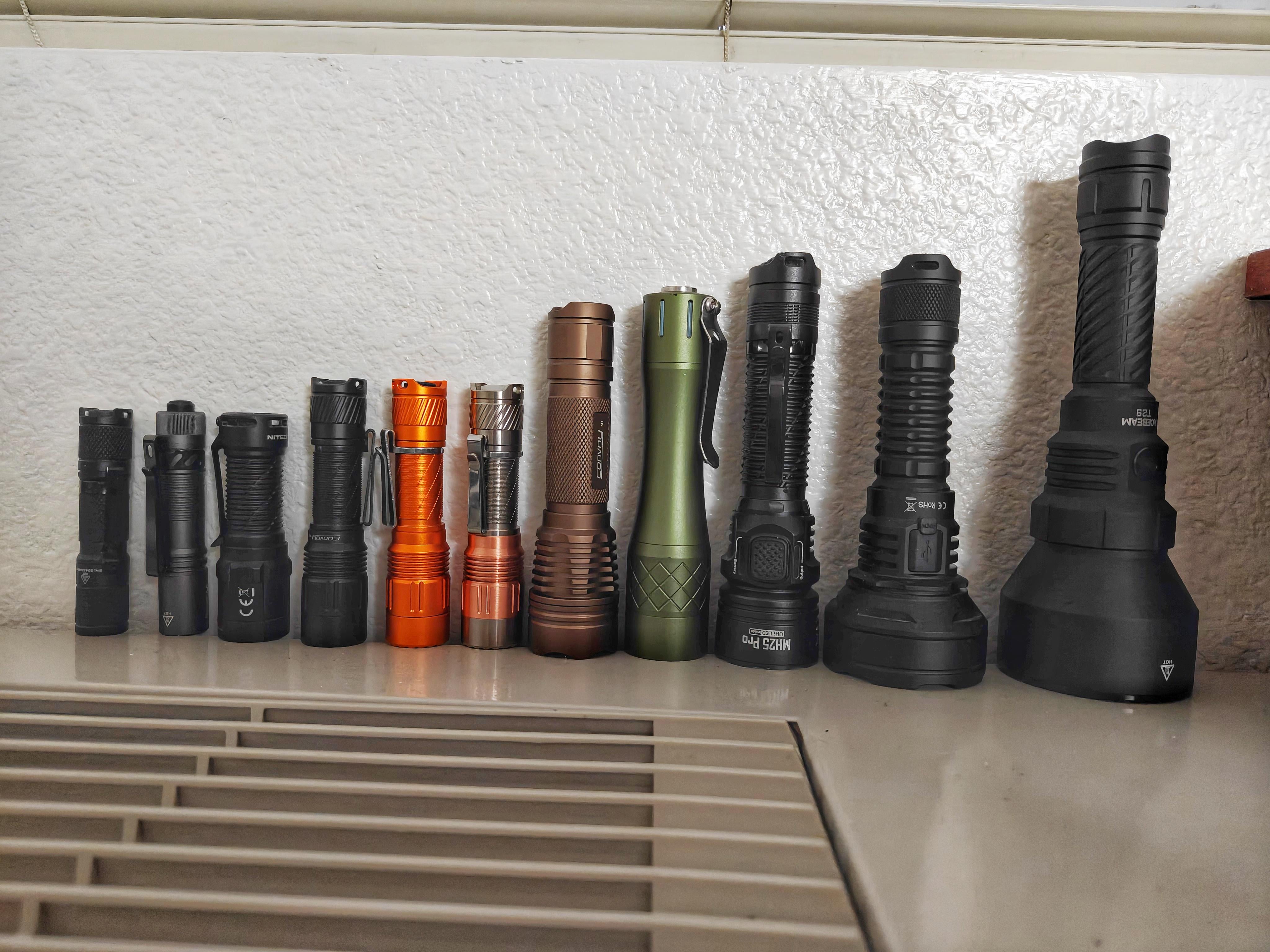 From L to R: Lumintop Tool AA UV, Pokelit AA 1000 lumens, Nitecore MT1C Pro, Convoy T6 CSLNM1.TG-6500K, Convoy T6 SFT40-6500K, Convoy T6 SFT-25R-6500K, Convoy M1 SFT-42R-6500K, Nlightd L3 LEP, Nitecore MH25 Pro, Wurkkos TD01C and Acebeam T29 SFT-42R-6500K